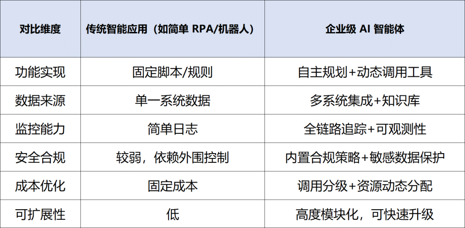 A:普通机器人基于固定脚本,无法灵活应对新问题;智能体具备调用外部工具、访问数据、规划任务的能力,更贴近人类助手。