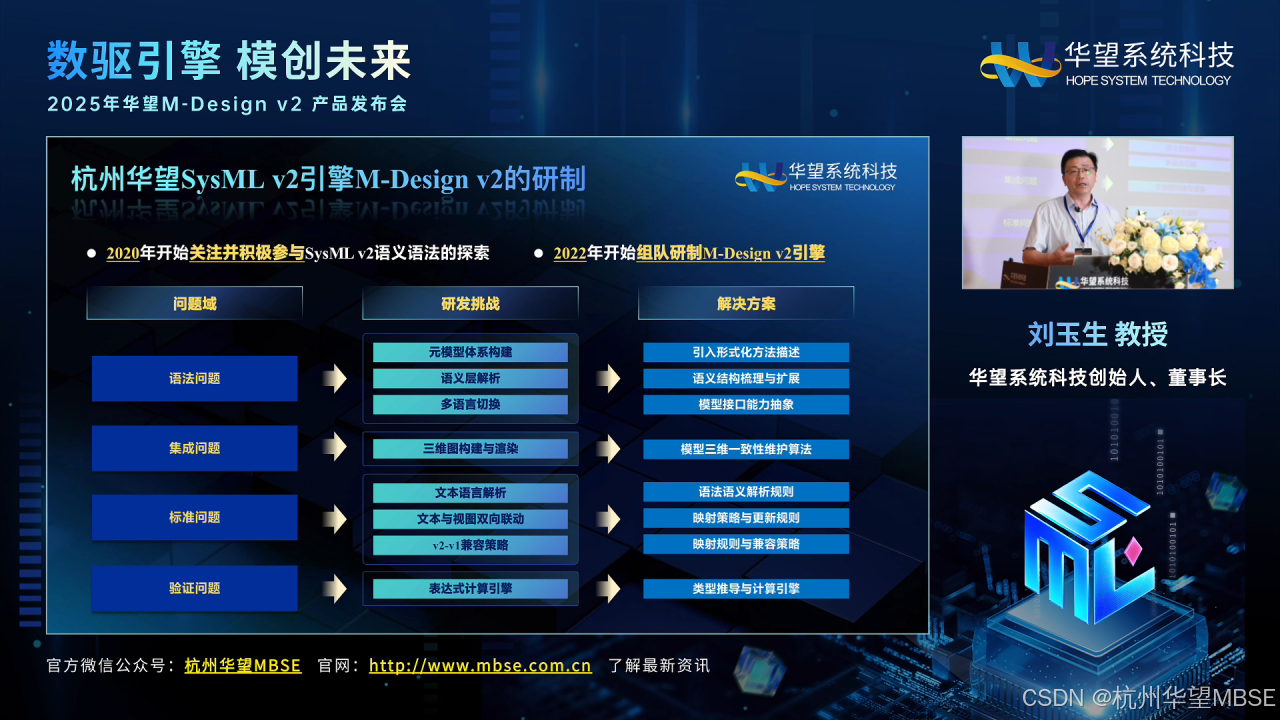 发布会上,华望系统科技创始人、董事长刘玉生教授致开幕词,并简要介绍了SysML v2规范产生的历史沿革。刘教授强调,在当今全球数字化变革势不可挡之际,我国已将行业数字化转型工作置于重要的前沿和战略地位。华望早在2020年便做出了前瞻布局,积极投身于SysML v2语义语法的探索,组建研发团队攻克诸多的技术难题。如今M-Design v2软件的正式发布将赋予华望为企业提供更高效、更智能的MBSE解决方案的能力,助力我国在高端装备设计领域迈向更高质量的发展。