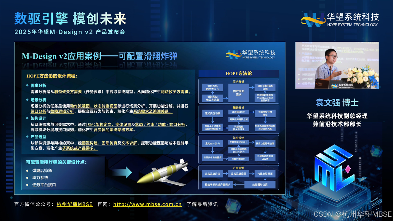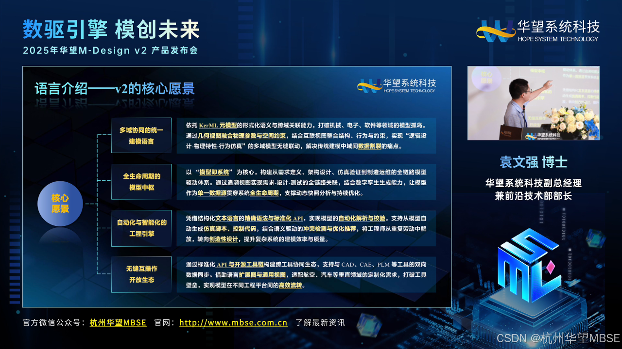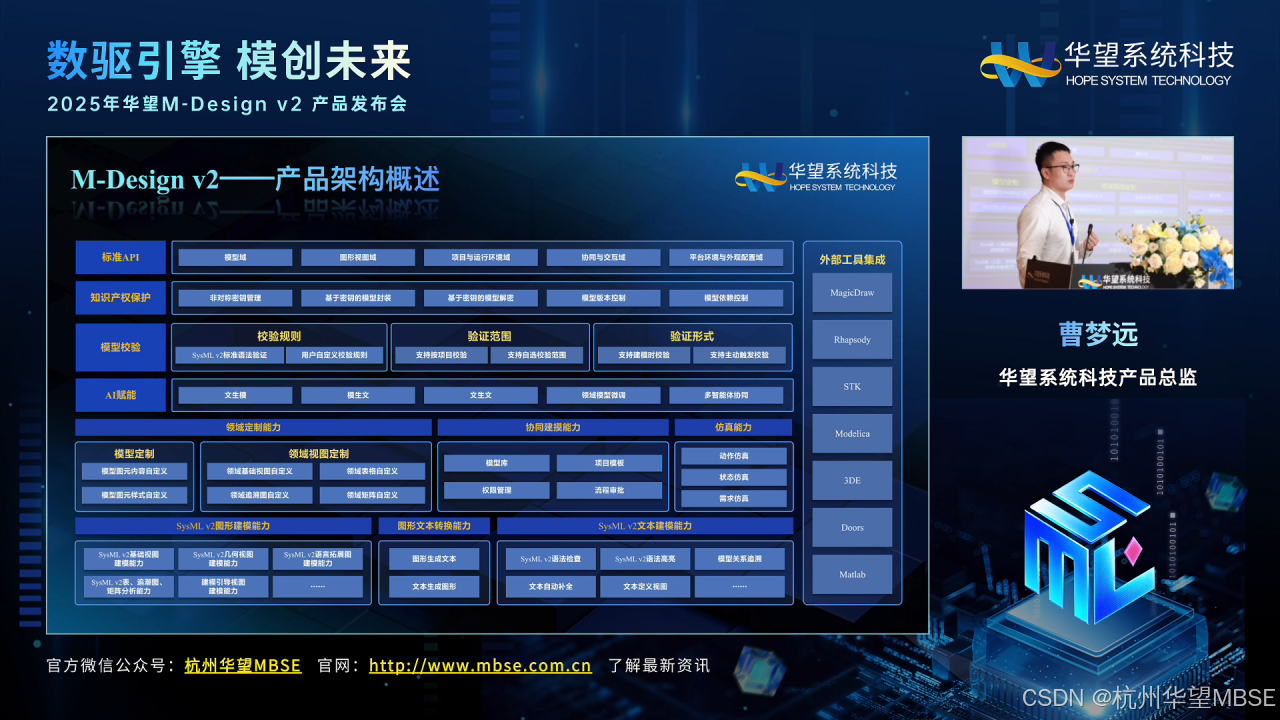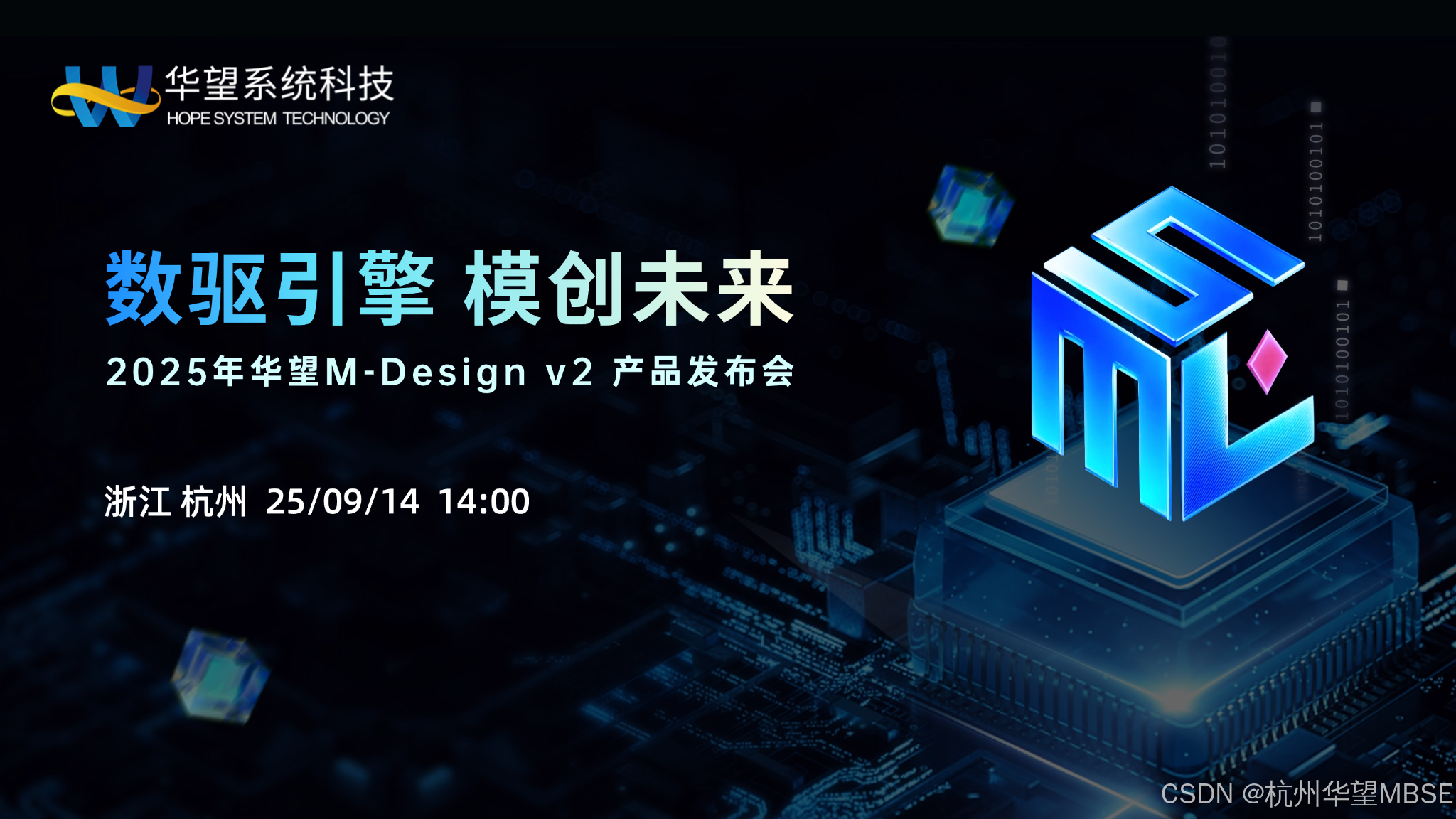 9月14日下午2点整,“数驱引擎 模创未来”2025年华望M-Design v2软件线上发布会盛大启幕。这场汇聚行业目光、引领技术潮流的盛会,将3000余位行业专家、领导、合作伙伴及客户齐聚云端,共同见证国内首款具有完全自主知识产权的、基于SysML v2规范的新一代系统建模与仿真软件M-Design v2的华丽亮相!