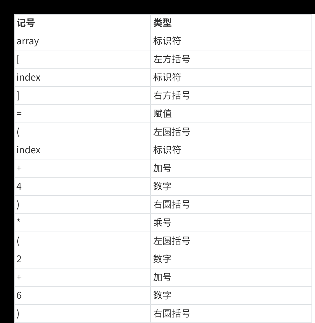 将源代码程序被输入扫描器,扫描器的任务就是简单的进行词法分析,把代码中的字符分割成一系列的记号(关键字、标识符、字面量、特殊字符等)。上面程序进行词法分析后得到了16个记号: