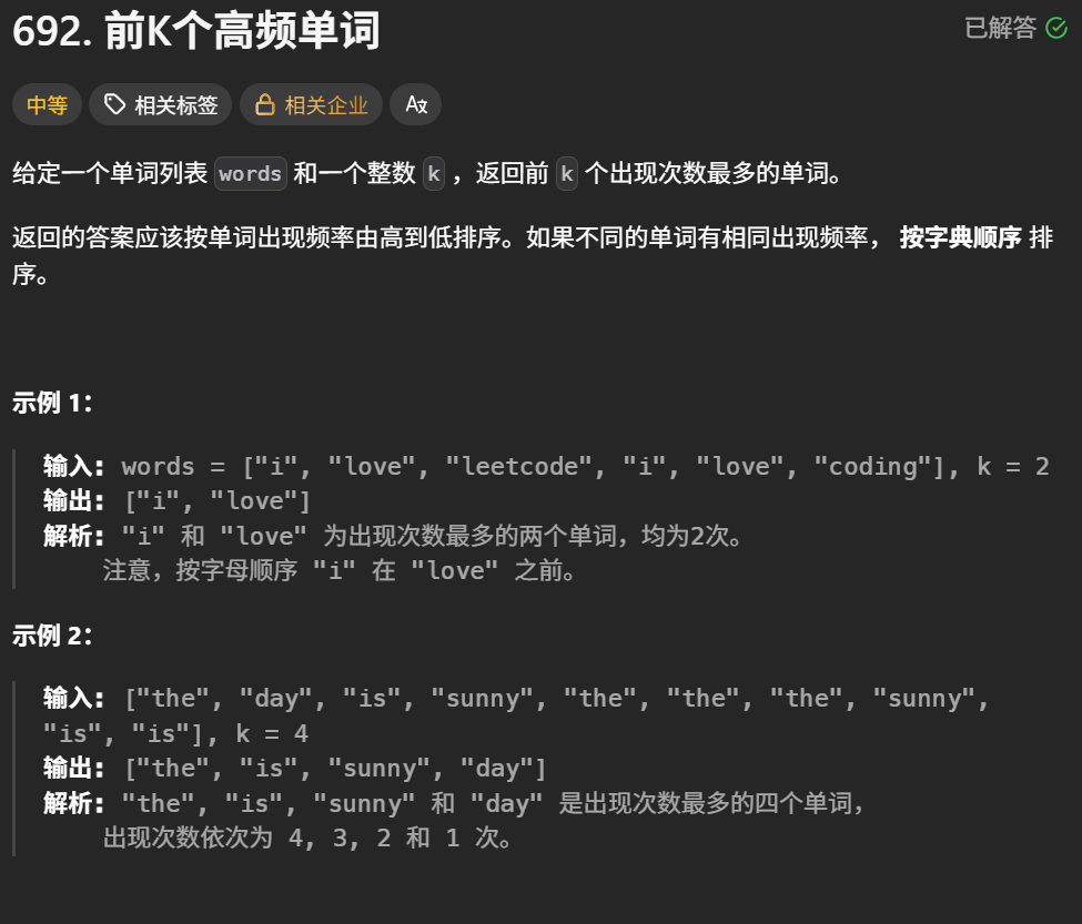 优先级队列(prioriry_queue)我们最常用于堆的排序中,其弹出元素的顺序并不是FIFO,而是根据优先级弹出,这个优先级最常见的就是根据大或小,当然还有我们自己定义的大或小。这题也属于TOPK问题,但我们发现这题的比较条件有点特殊,首先要保证出现次数最多优先,次数相同的话,还要根据字典序输出,如果要照顾次数,我们当然是小根堆,照顾字典序,要用大根堆。有的时候,堆中建的并不是int,而是st