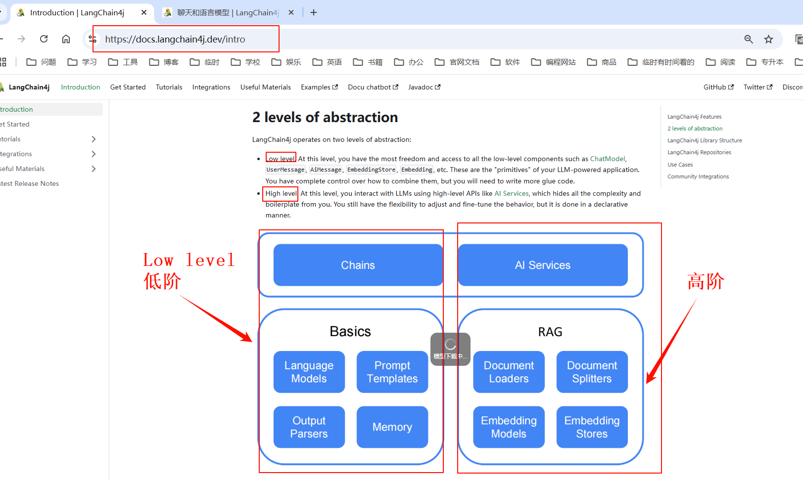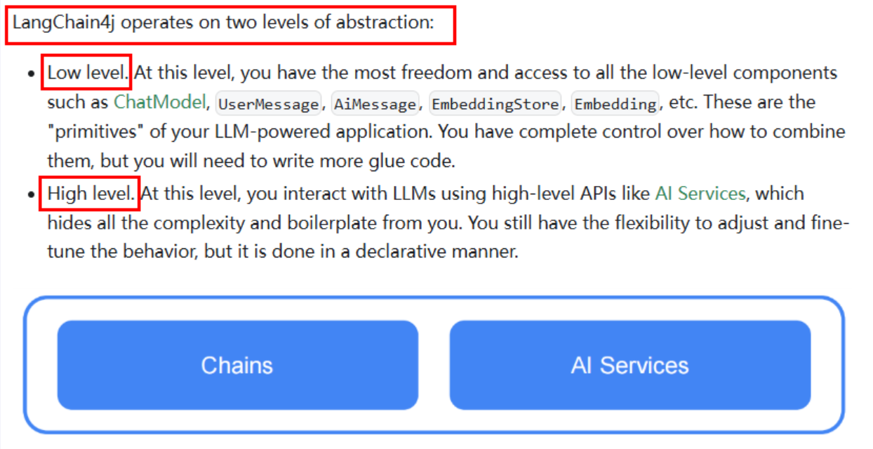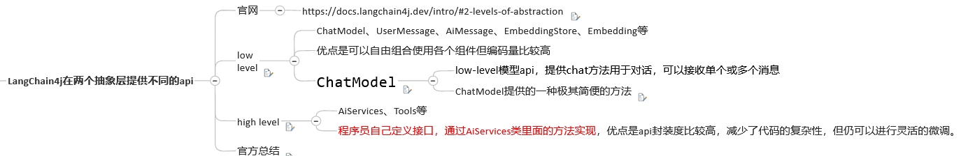 LangChain4j在两个抽象层(低阶 / 高阶)提供不同的 api