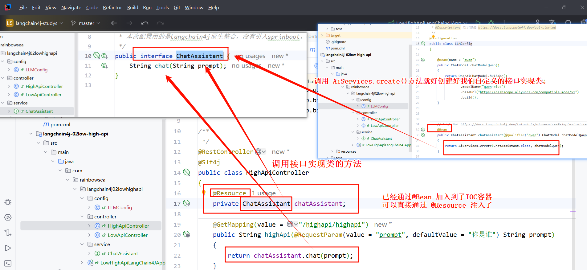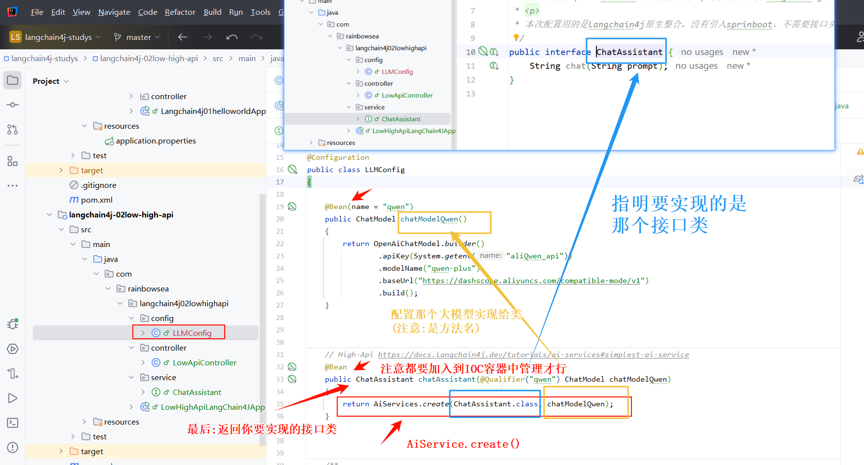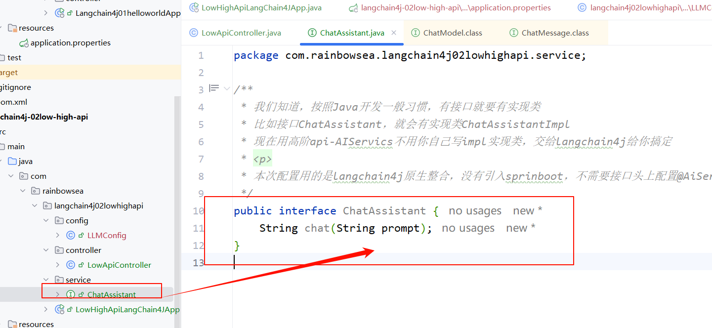 我们知道,按照Java开发一般习惯,有接口就要有实现类 比如接口ChatAssistant,就会有实现类ChatAssistantImpl现在用高阶api- AIServics不用你自己写 impl实现类,交给langchain4j给你搞定。(接口名是随意的,你只要见名之意即可)