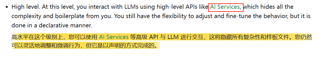 - 高层次。在这个层次上,您使用高级 API(如 AI 服务)与 LLM 交互, 它隐藏了所有复杂性和样板代码。 您仍然可以灵活地调整和微调行为,但是以声明式方式完成。