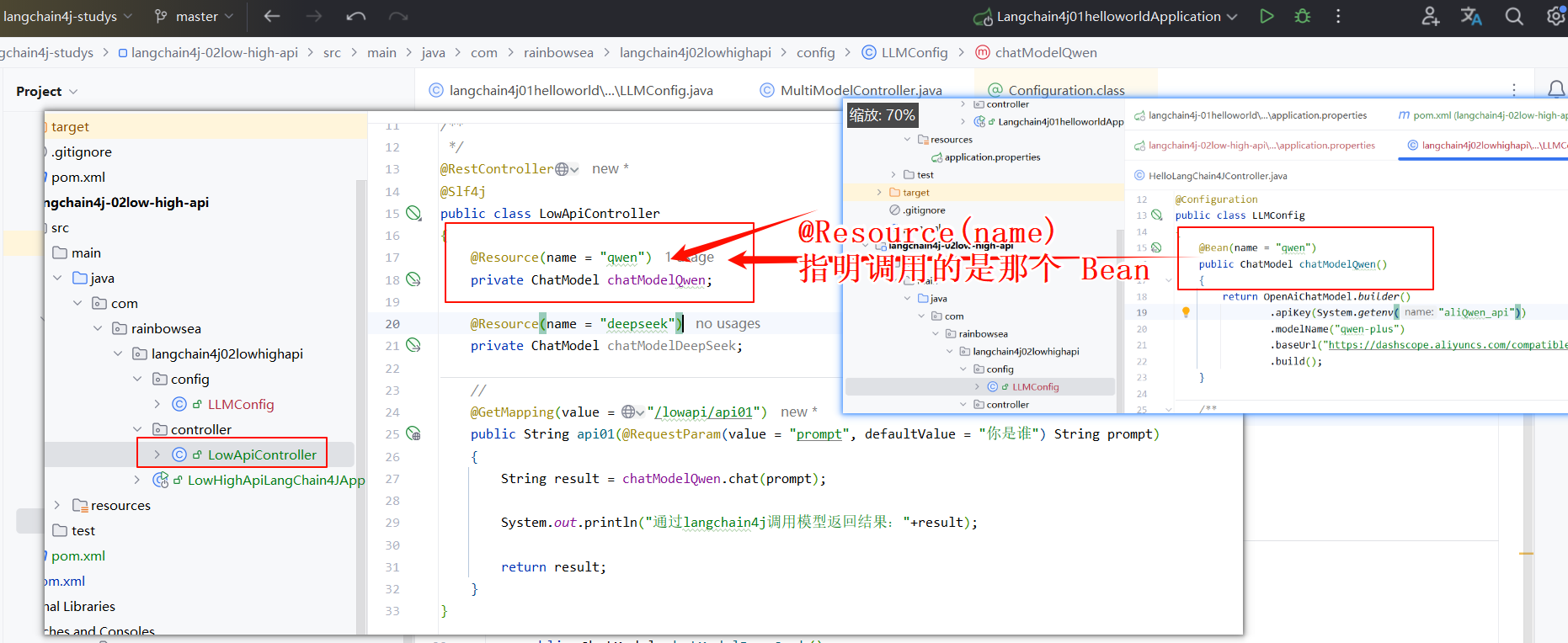 - 对我们自我编写的 AI Service 的接口类,配置器实现类的配置(配置指明那个大模型实现我们这个接口类),配置好后,调用