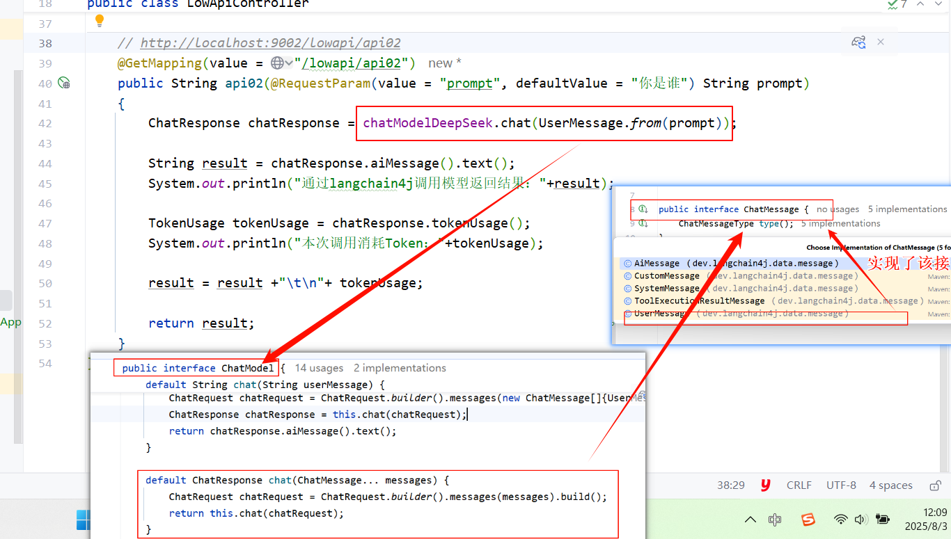 编写 Controller ,如下,其实就是跟我们编写的第一个连接大模型的 Hello World 是一样的