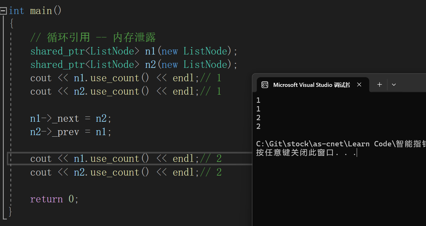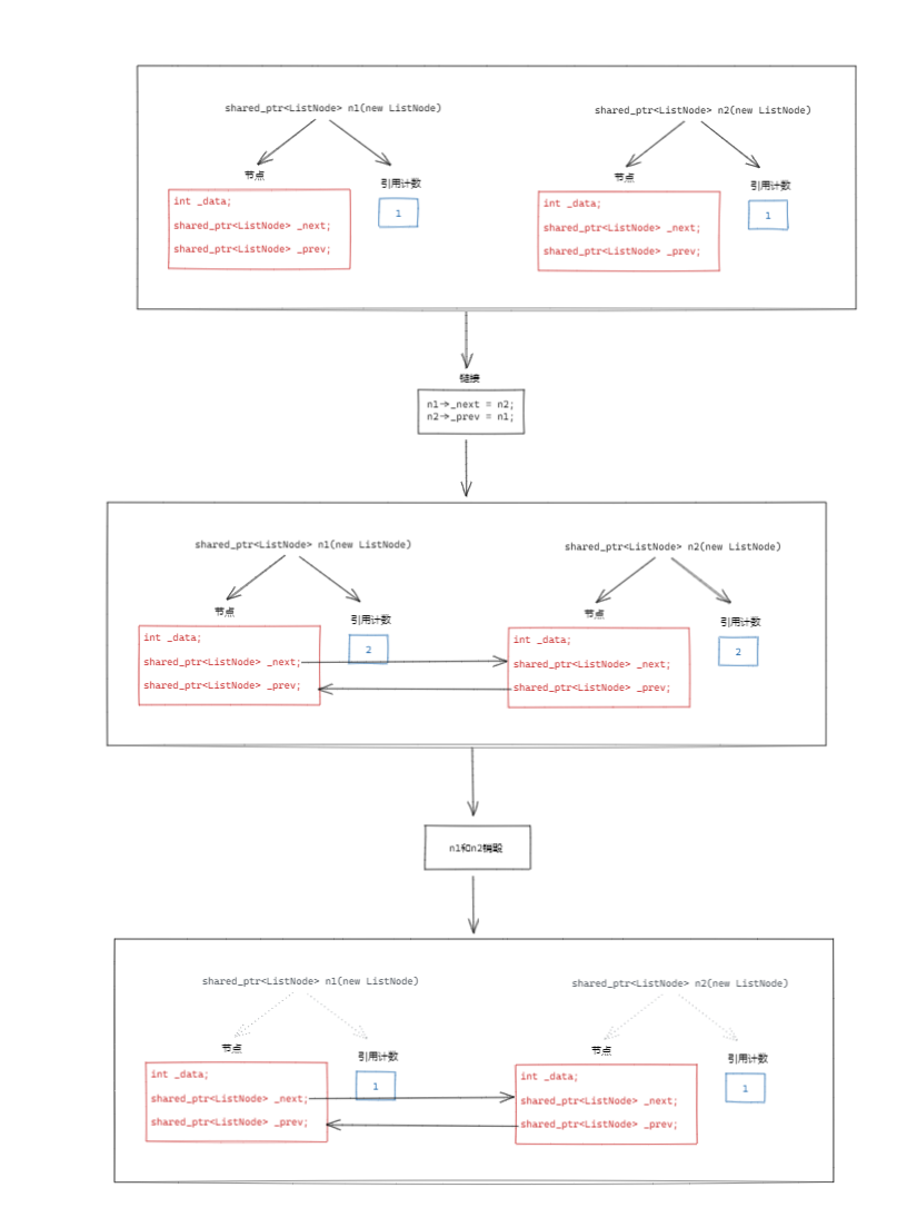观察打印结果可以很明显的发现——n1 和 n2 的析构函数并没有进行调用,这就是shared_ptr循环引⽤问题导致的内存泄漏