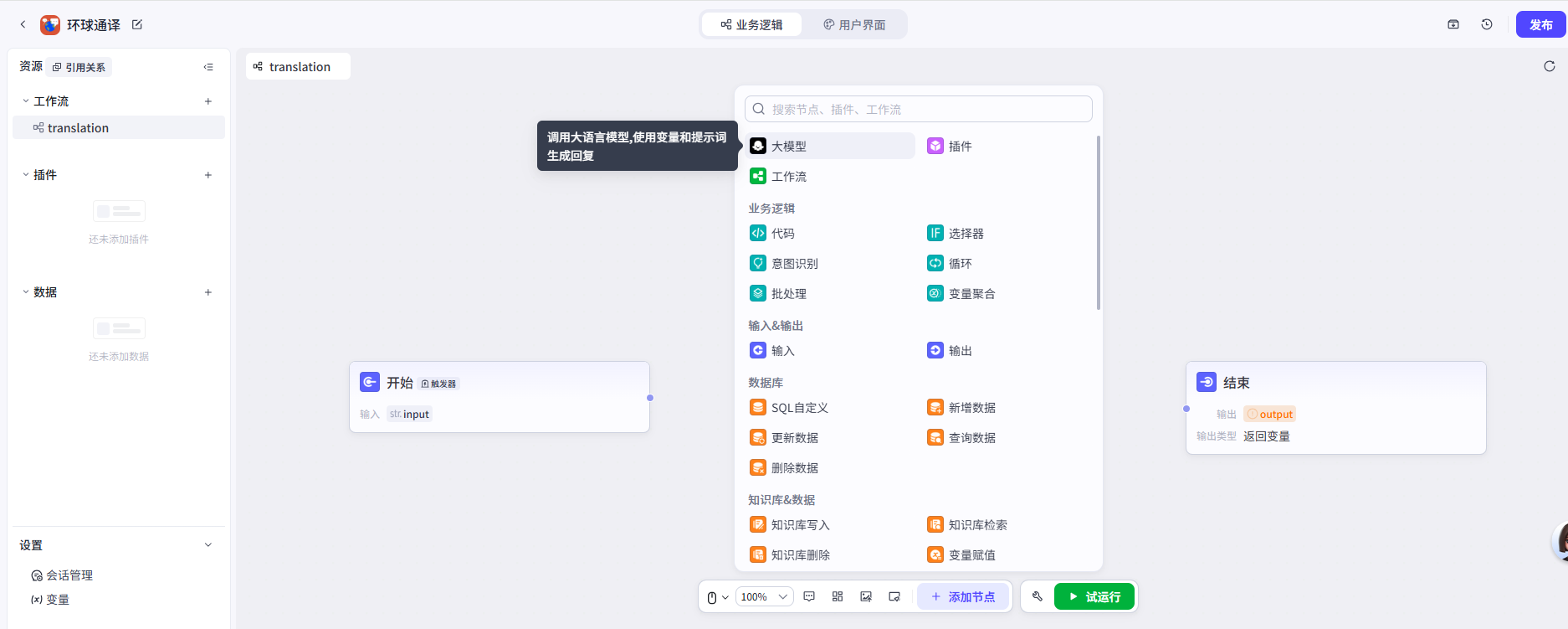 要把开始、大模型插件、结束这里面的数据全部都要配置好。然后才能串起来。