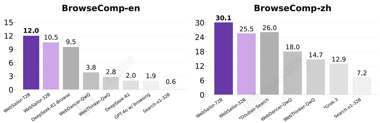 结果如何?WebSailor-72B 在 BrowseComp-zh 上以 30.1% 的准确率追平字节跳动闭源产品豆包,把最强开源竞品直接拉开 15 个点;3B 小模型也能越级打平 32B 对手,真正做到了"参数小、推理大"。更难能可贵的是,它向下兼容 SimpleQA、GAIA 等简单任务,实现"一套权重打全场"。