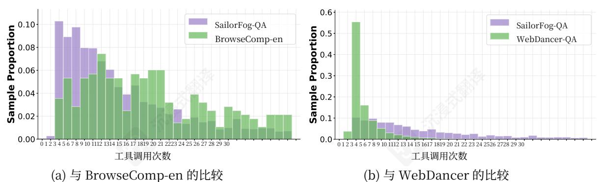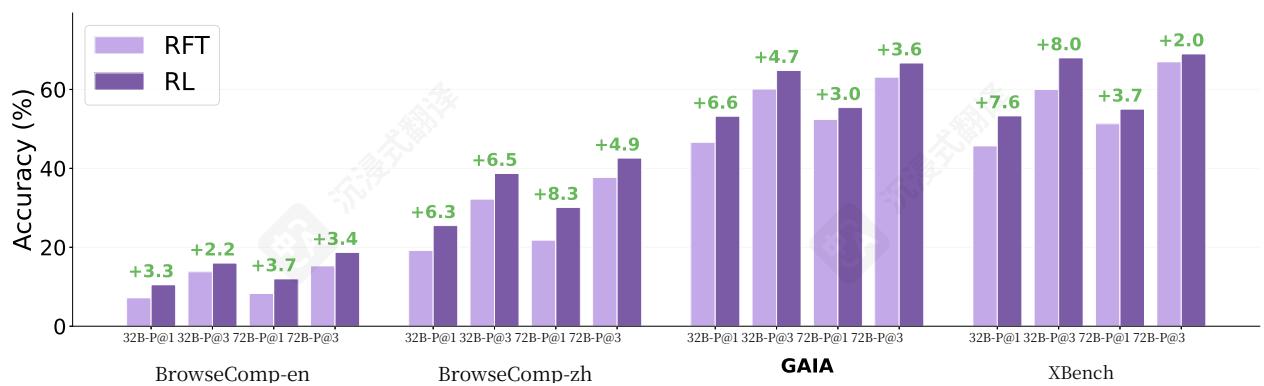 Pass@1 vs Pass@3我们通过比较WebSailor在RL阶段前后(图5)的Pass@1和Pass@3性能来分析我们的RL训练的影响。结果表明,RL在所有基准测试中都带来了显著的改进,其中在高度困难的BrowseComp- en/zh任务上观察到的收益最为显著。这种差异是具有启示性的:BrowseComp的极端复杂性要求智能体生成非常长且复杂的轨迹,这使得稳定、可重复的成功具有挑战性(Sun等人,2025年)。这种不稳定性在Pass@1和Pass@3分数之间初始的巨大差距中明显表现出来。RL训练通过强化成功的策略并修剪无效的策略直接解决了这个问题,这显著提高了模型收敛到连贯解路径的能力。因此,模型的稳定性得到增强,在更难的基准测试上带来了更大的收益。此外,我们观察到Pass@1的改进比例远大于Pass@3,这表明RL大幅提高了样本效率(Yue等人,2025年),允许模型仅使用一个样本就能接近其全部潜力。