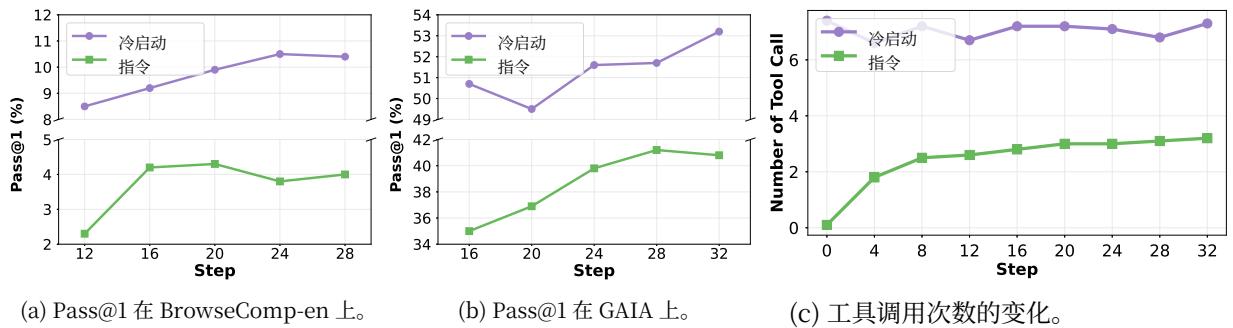 有/无冷启动为了评估我们的RFT冷启动策略的有效性,我们将它与直接RL训练基线进行比较,结果如图6所示。我们观察到,虽然直接RL方法在Pass@1准确率上表现出更大的提升,但经过RFT冷启动的模型的最终收敛性能明显更优。这种性能差距也反映在模型工具使用模式中。冷启动模型的工具调用次数在整个RL训练过程中保持高且稳定,而直接RL模型的工具调用次数尽管稳步增加,但始终显著较低,表明其无法掌握长时程推理能力。关键在于,冷启动的WebSailor与直接RL模型在BrowseComp- en上的性能差距要大得多。这表明,如果没有RFT冷启动,模型极难仅通过自我探索来获取复杂的推理模式——这些模式通常只在强大的LRMs中出现。冷启动对于用这些复杂策略引导模型至关重要,这些策略对于解决极具挑战性的任务来说是必要的。