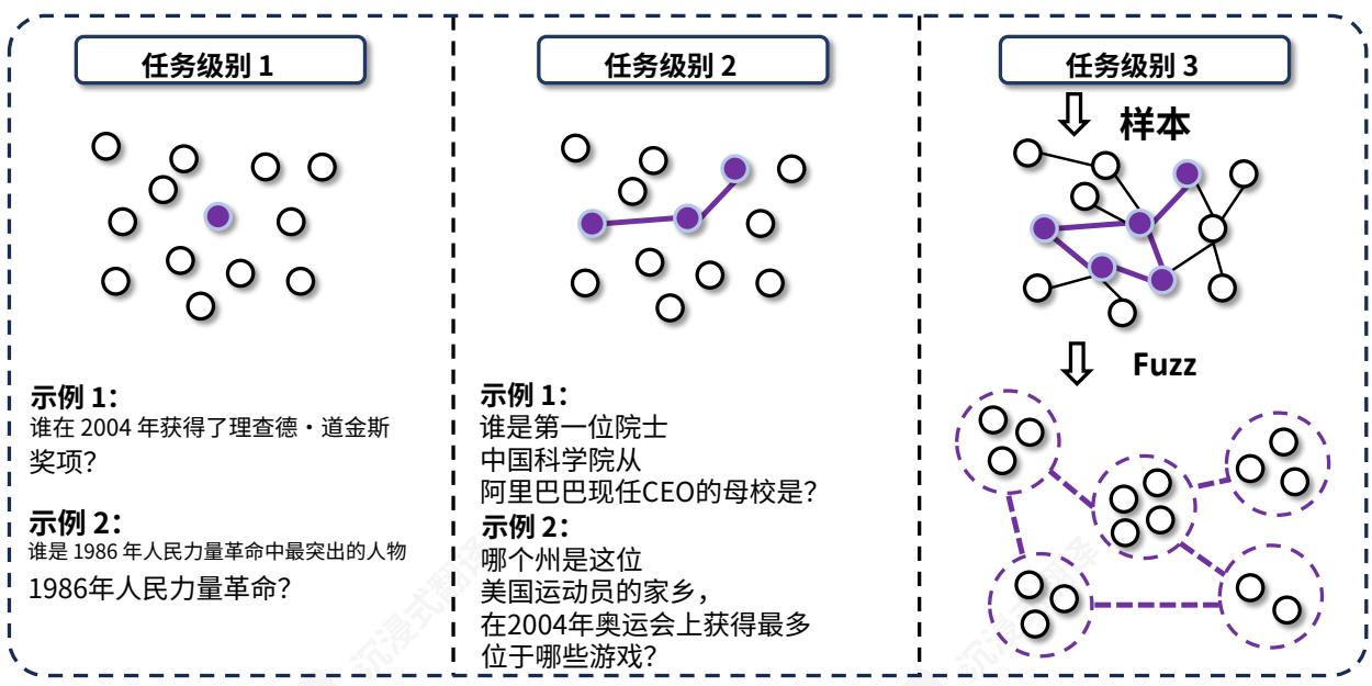 图2:信息获取任务可分为三个级别。级别1具有相对简单的逻辑结构,可以直接回答或通过单个、简单的工具调用回答。级别2类似于多跳问题,解决方案通过固定的推理步骤获得。级别3在模糊化后表现出最复杂和多变的拓扑结构,难以手动定义,其固有不确定性难以减少。