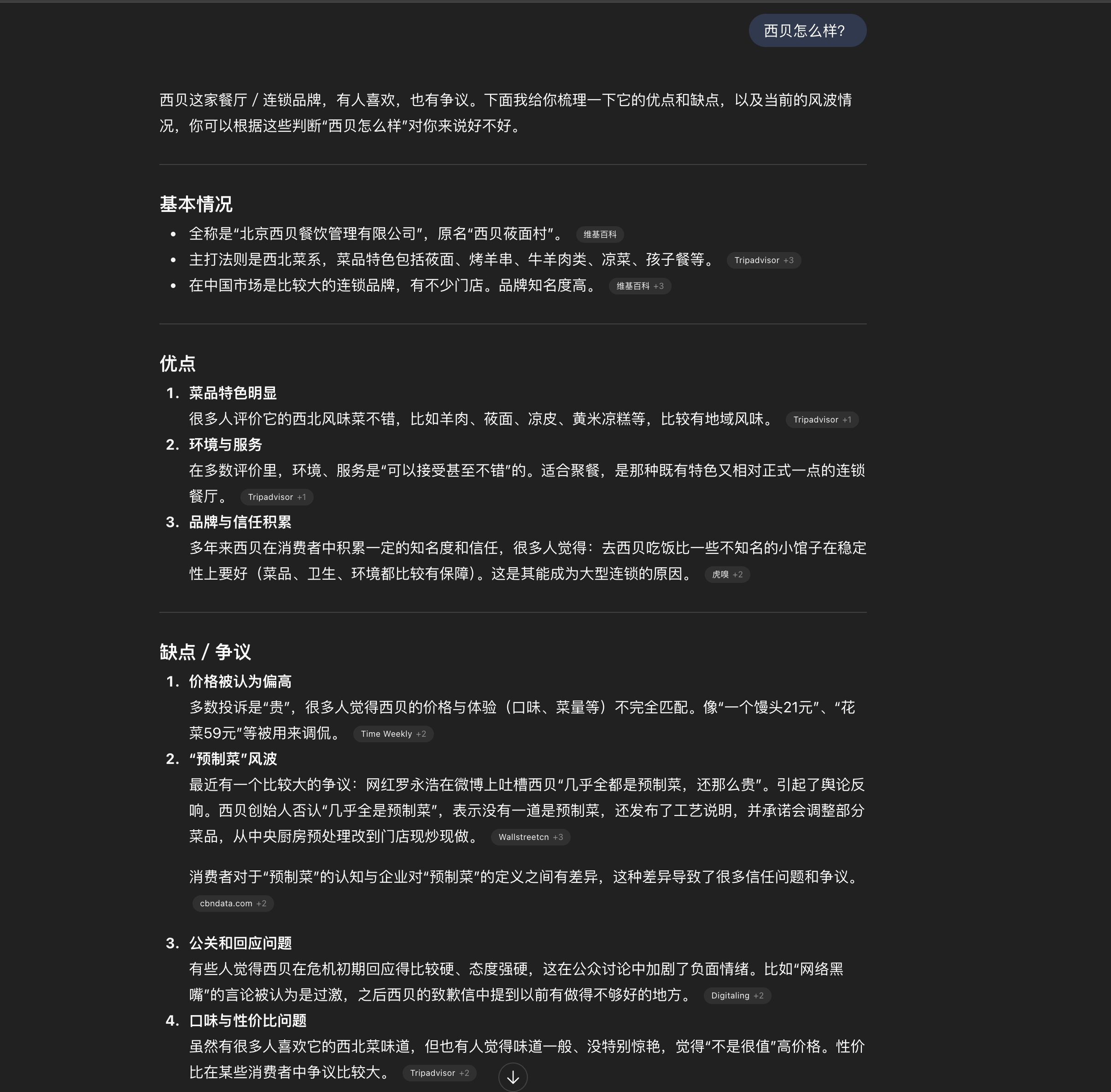 现在你去问 DeepSeek,“西贝怎么样?”十有八九AI会说:菜贵、预制菜争议、消费者吐槽、公关不当……AI就像复读机,把网上的负面信息浓缩完再糊你脸上。