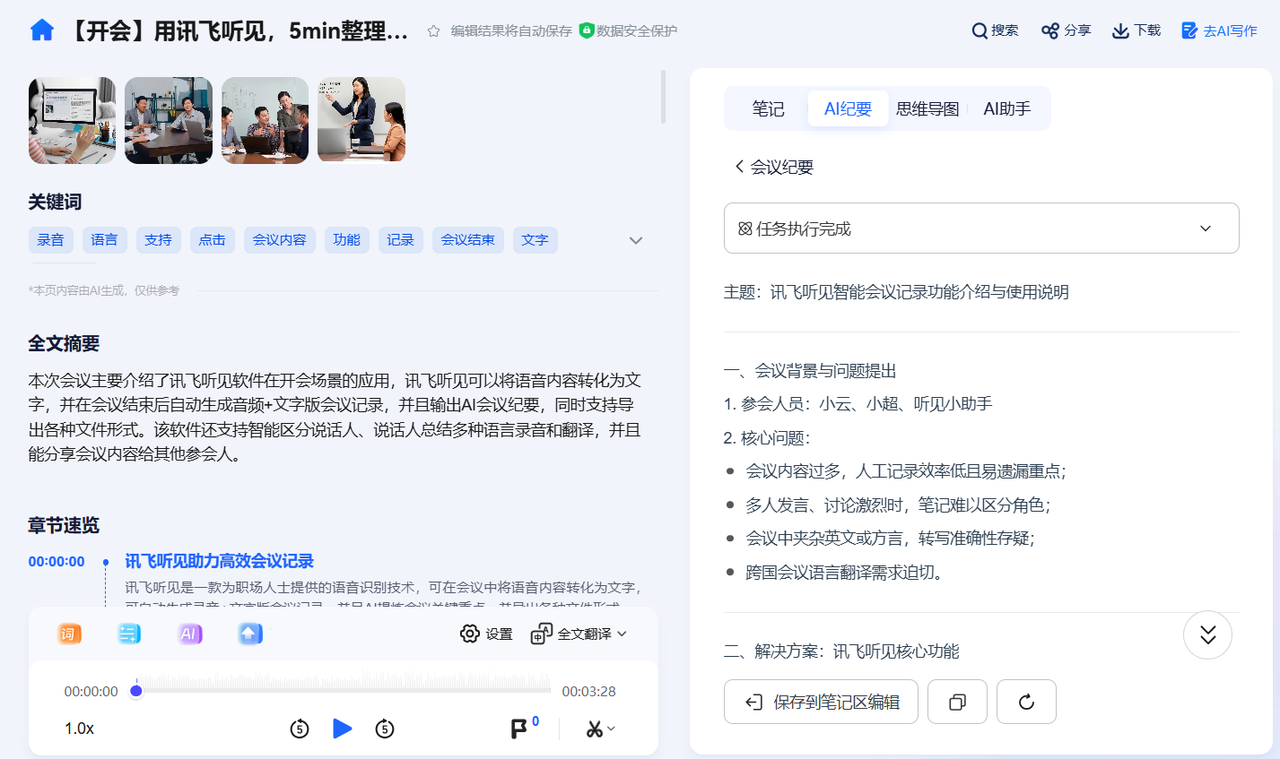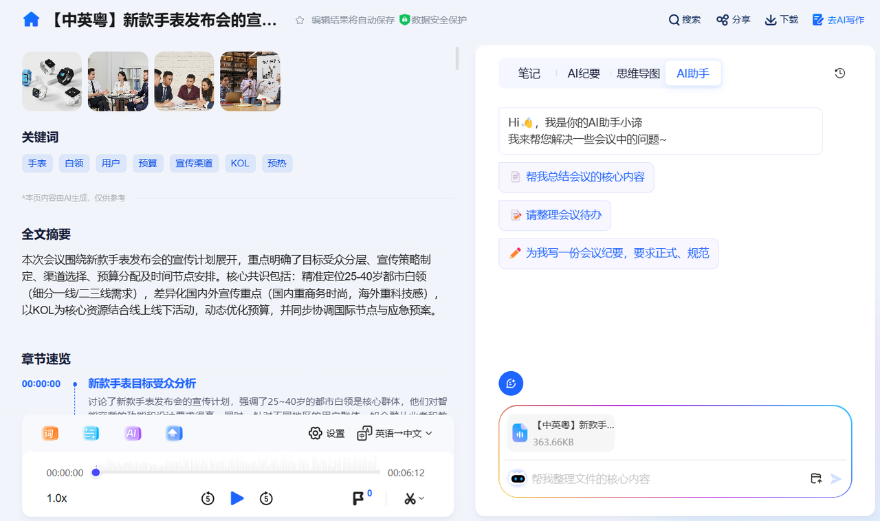 最让我惊喜的是其AI纪要和AI总结功能。系统能够自动识别关键信息点,生成清晰的会议纪要框架,还能对长篇录音内容进行智能总结,提取核心要点。这些功能在处理长时间的咨询录音时特别有用,帮我节省了大量整理时间。目前这些AI功能都可以免费使用,对于需要频繁处理录音材料的专业人士来说是个不错的选择。