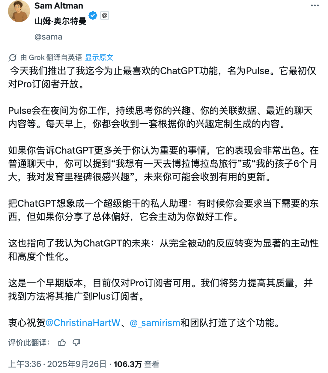 就在不久前,OpenAI正式为Pro用户(再次仅限于付费用户)推出了ChatGPT Pulse的预览版本,未来计划逐步覆盖Plus用户,最终目标是让所有用户都能体验。