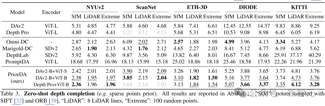 表 3展示了使用不同种类和稀疏性水平的稀疏点作为先验时的零样本深度补全结果。