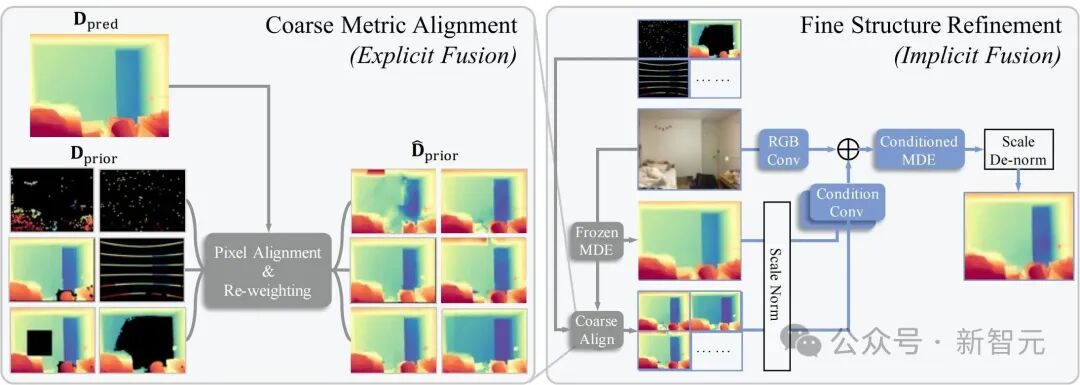 该方法通过粗到细的流程,先用像素级度量对齐将深度预测与先验融合,再利用条件化单目深度估计模型(conditioned-MDE)优化结果。