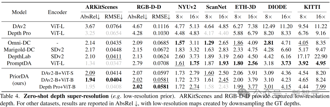 在这两个基准测试中,Prior Depth Anything相比于其他零样本方法取得了领先的性能。