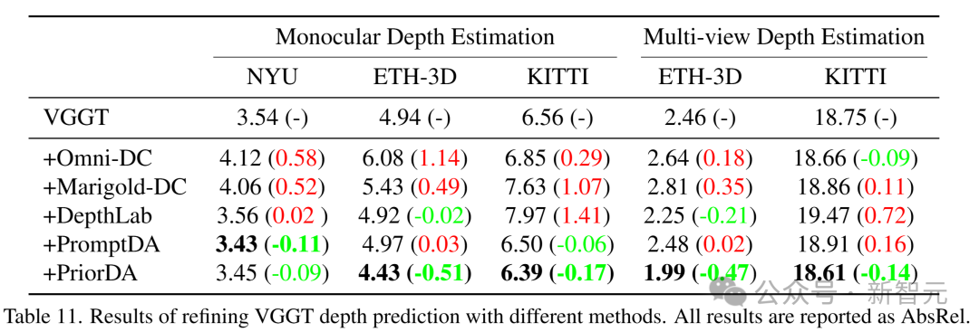 下表展示了VGGT在单目和多视角深度估计方面的性能,以及不同基于先验的方法作为细化器的有效性。