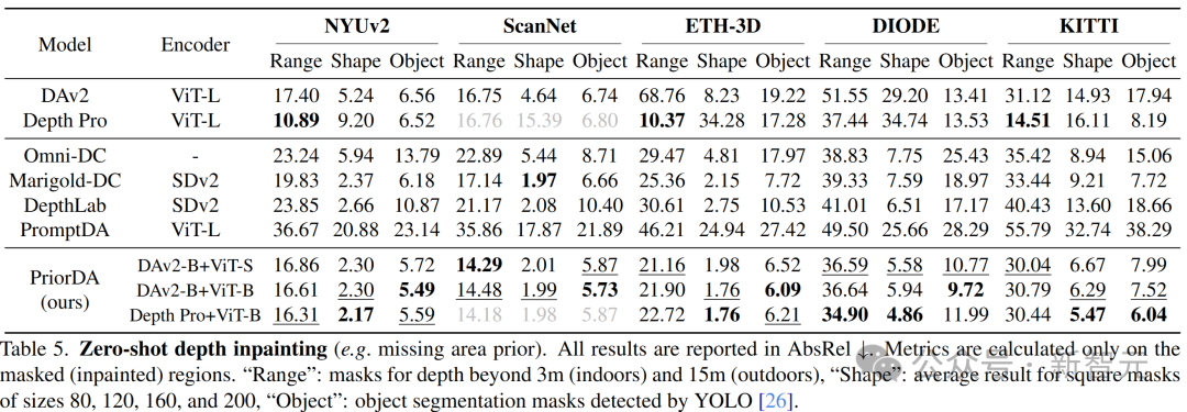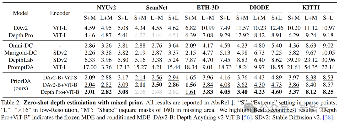 在表 2中定量评估了模型处理具有挑战性的未知混合先验的能力。就绝对性能而言,Prior Depth Anything的所有版本都优于对比基线。更重要的是,其受新模式深度先验的影响较小。