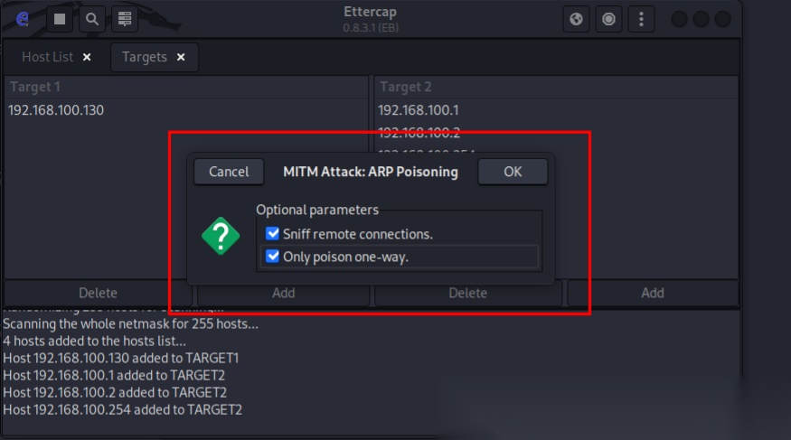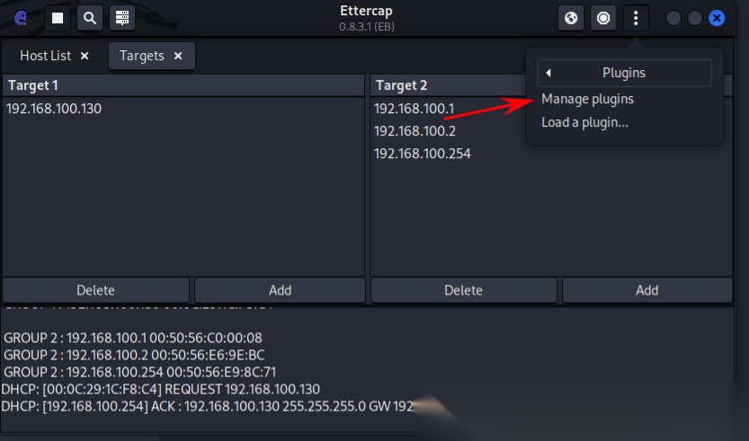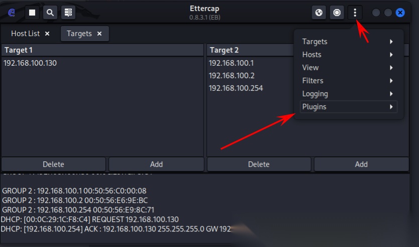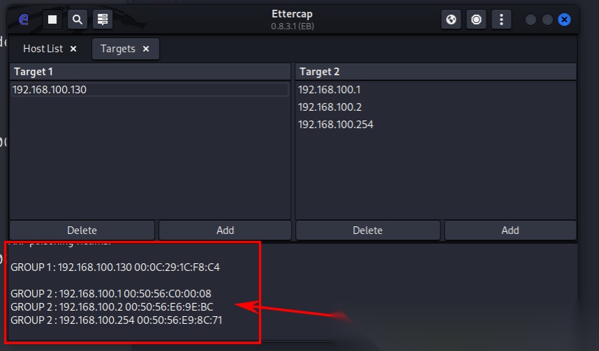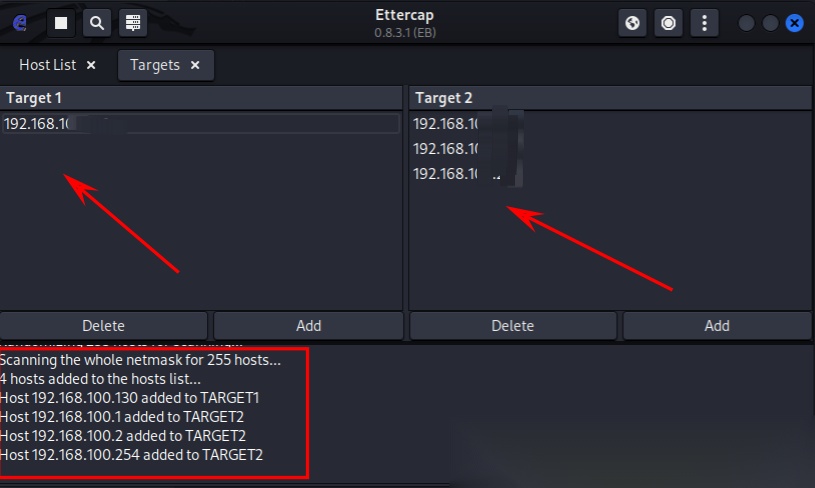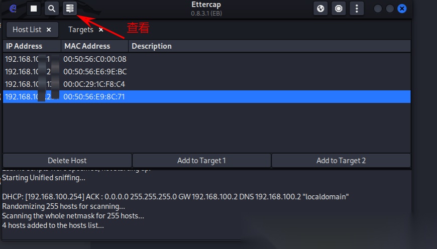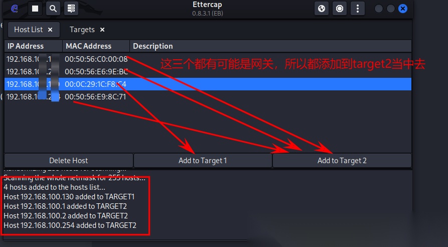 将靶机的ip添加到目标1当中,网关的ip添加到目标2当中,并查看