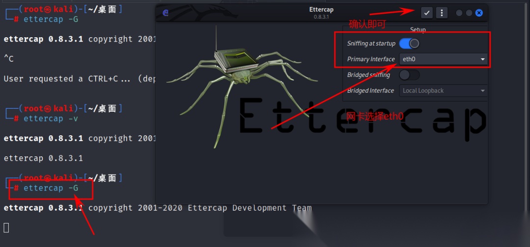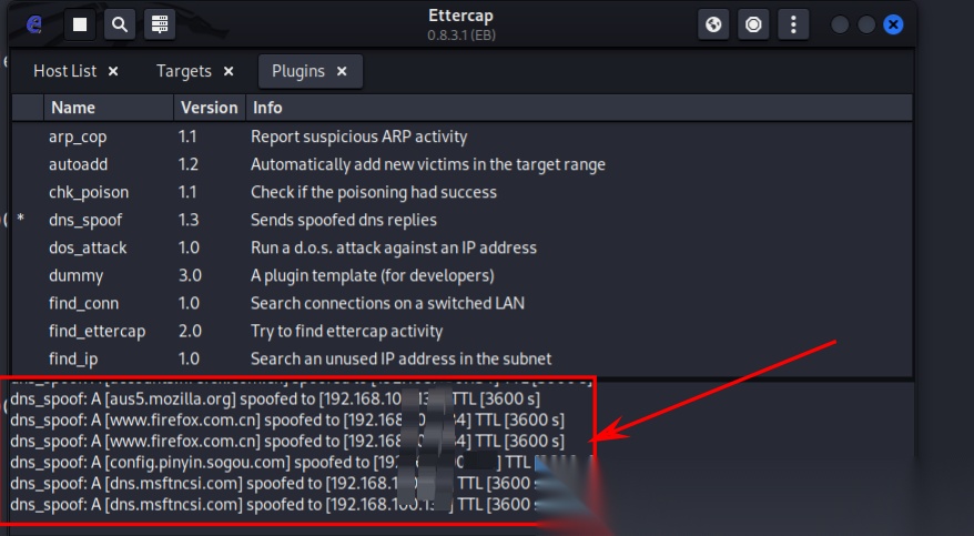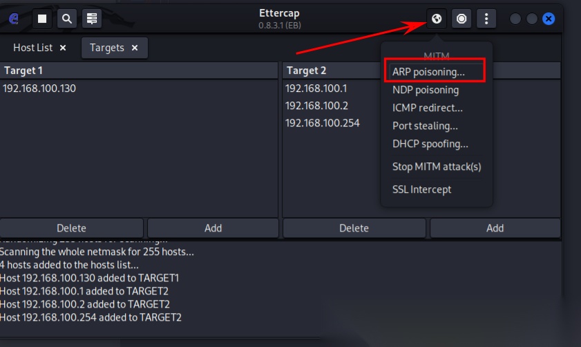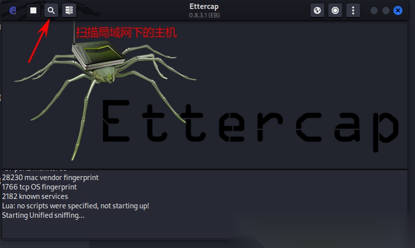 点击右上角的图标,进行ARP欺诈,测试是否成功: