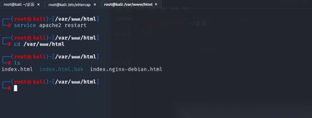 接下来启动kail自带的apache服务,输入命令service apache2 start打开apache服务,删除源文件(可以不删)重新编辑index.html文件,修改成自己想要的页面。