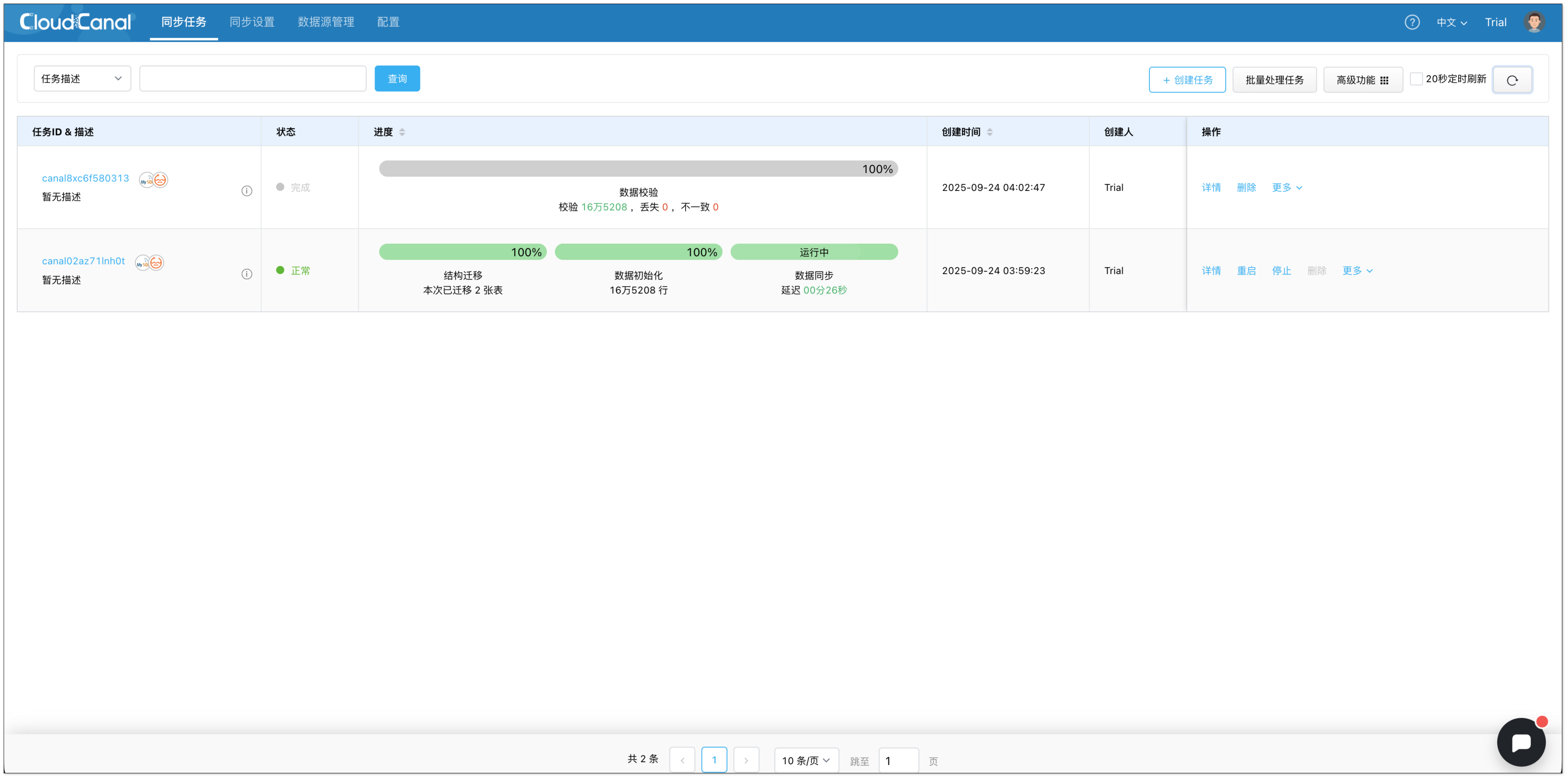 任务启动后,CloudCanal 将自动完成全量数据的初始化,并实时捕获增量变更写入 阿里云 DLF。