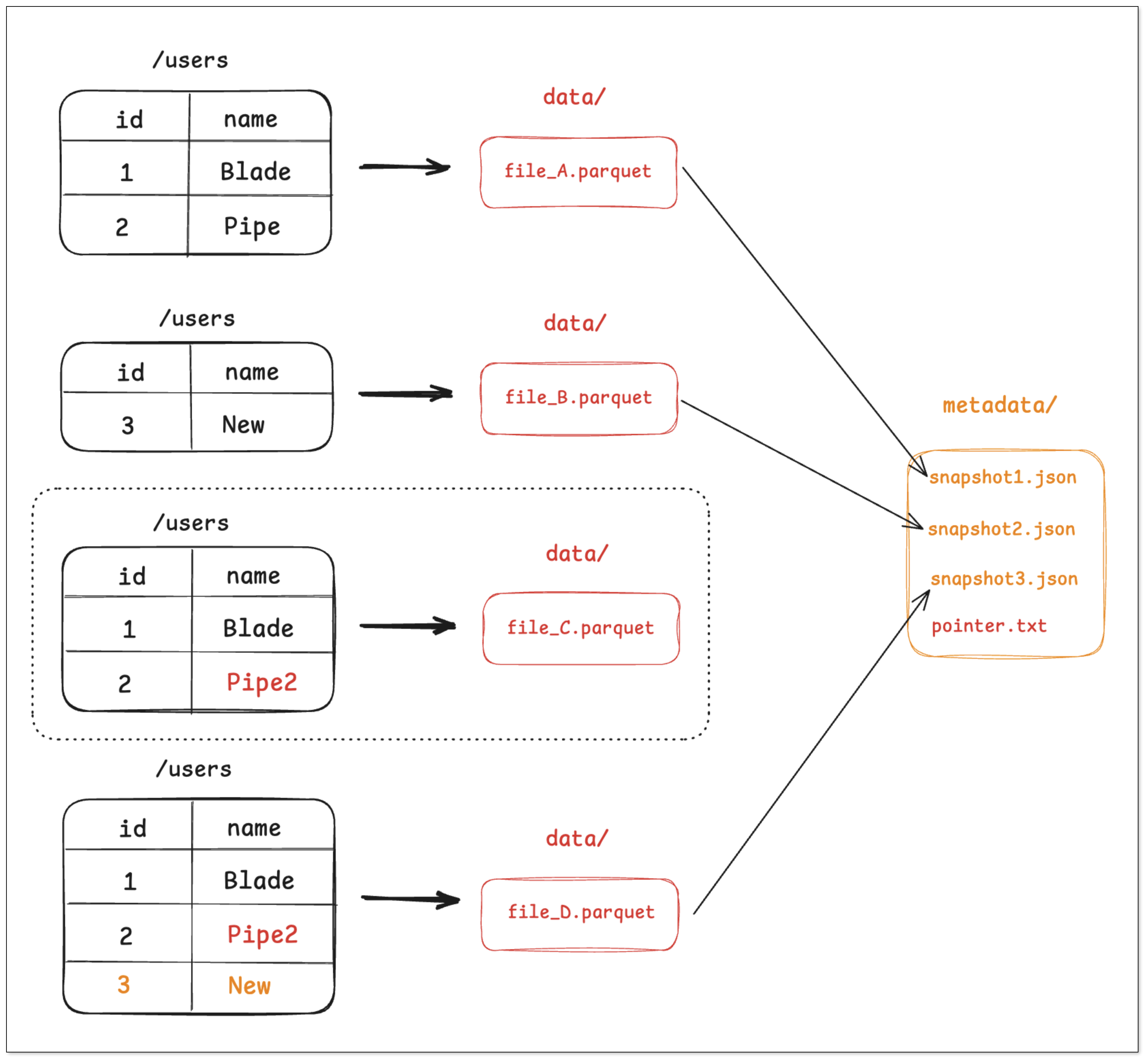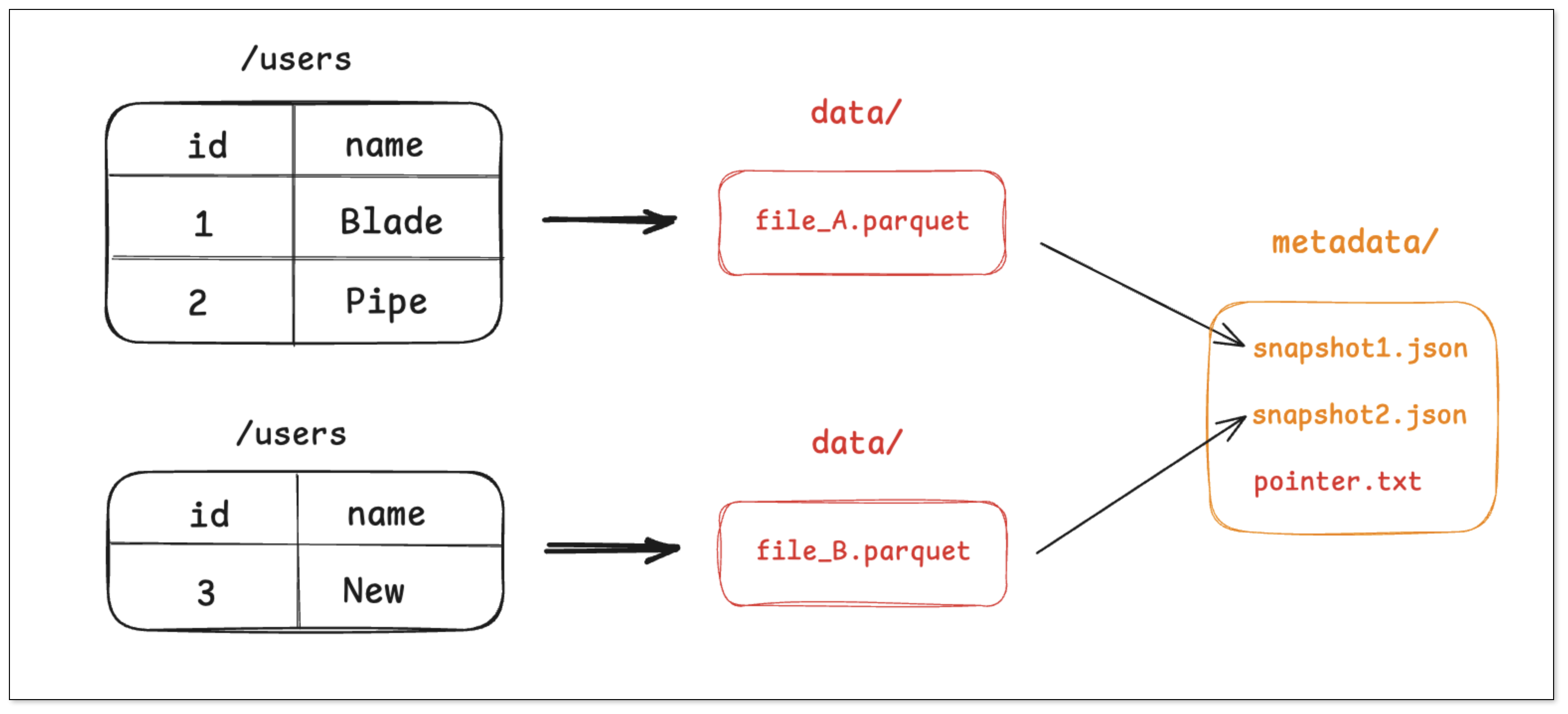 下面通过一个简单的例子来理解数据湖的核心原理,假设我们有一张用户表(users),要执行以下操作: