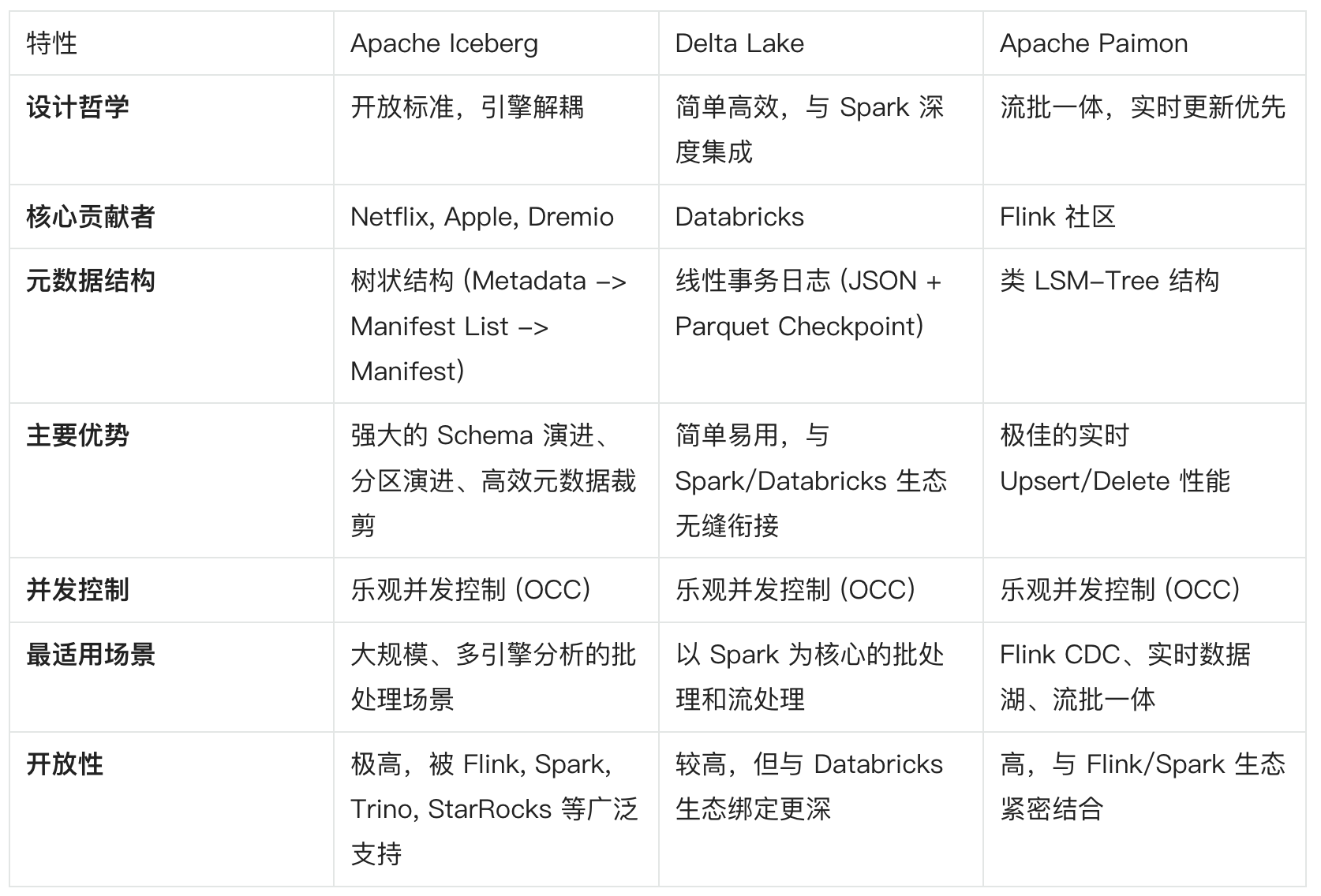 虽然核心思想相似,但 Iceberg 、Delta Lake 与 Paimon 在元数据结构、设计思路上存在显著差异,下面我们从几个核心维度进行更具体的对比。