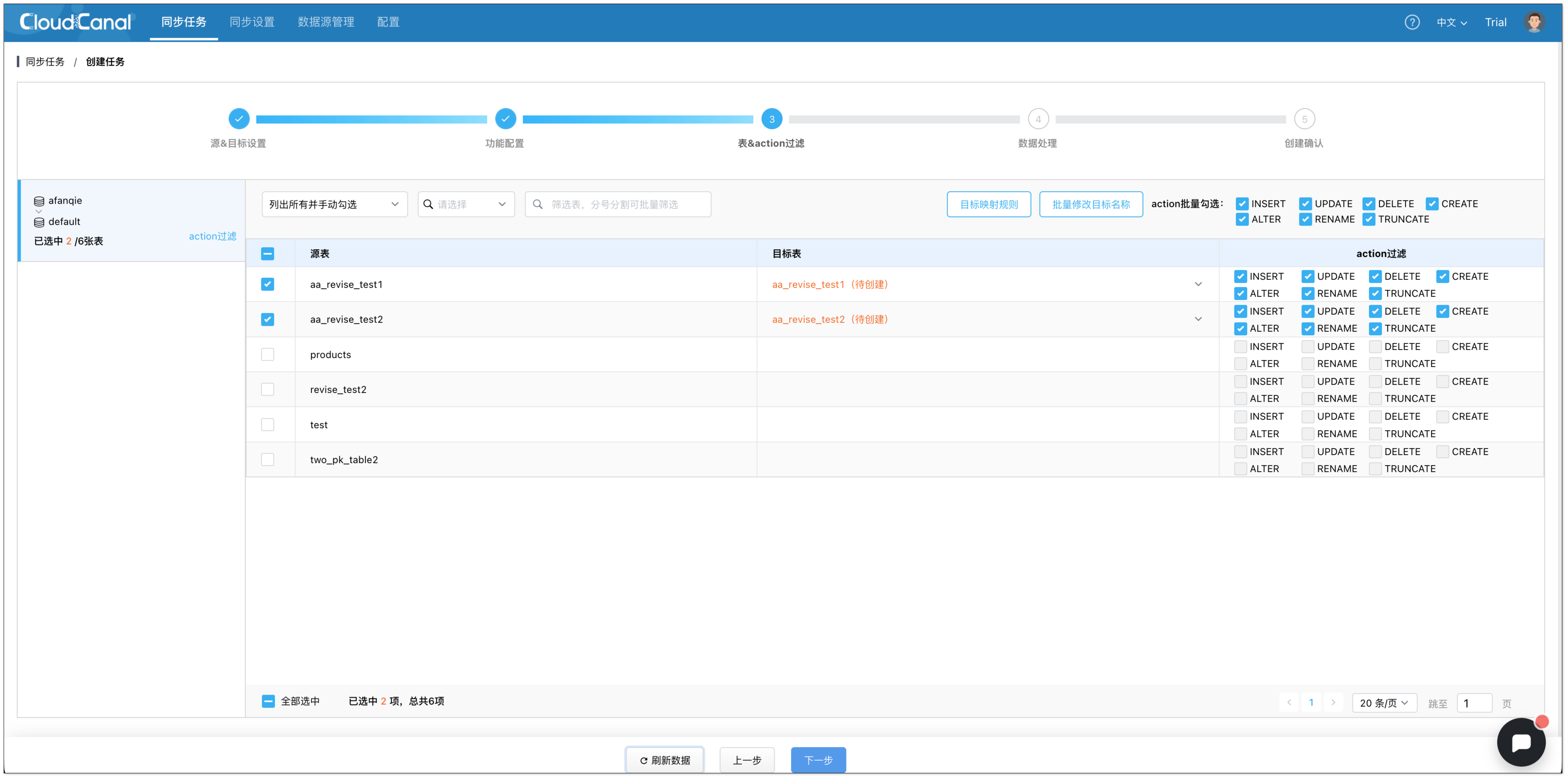 - 在 表和操作过滤 页面,选择需要迁移同步的表,可同时选择多张。