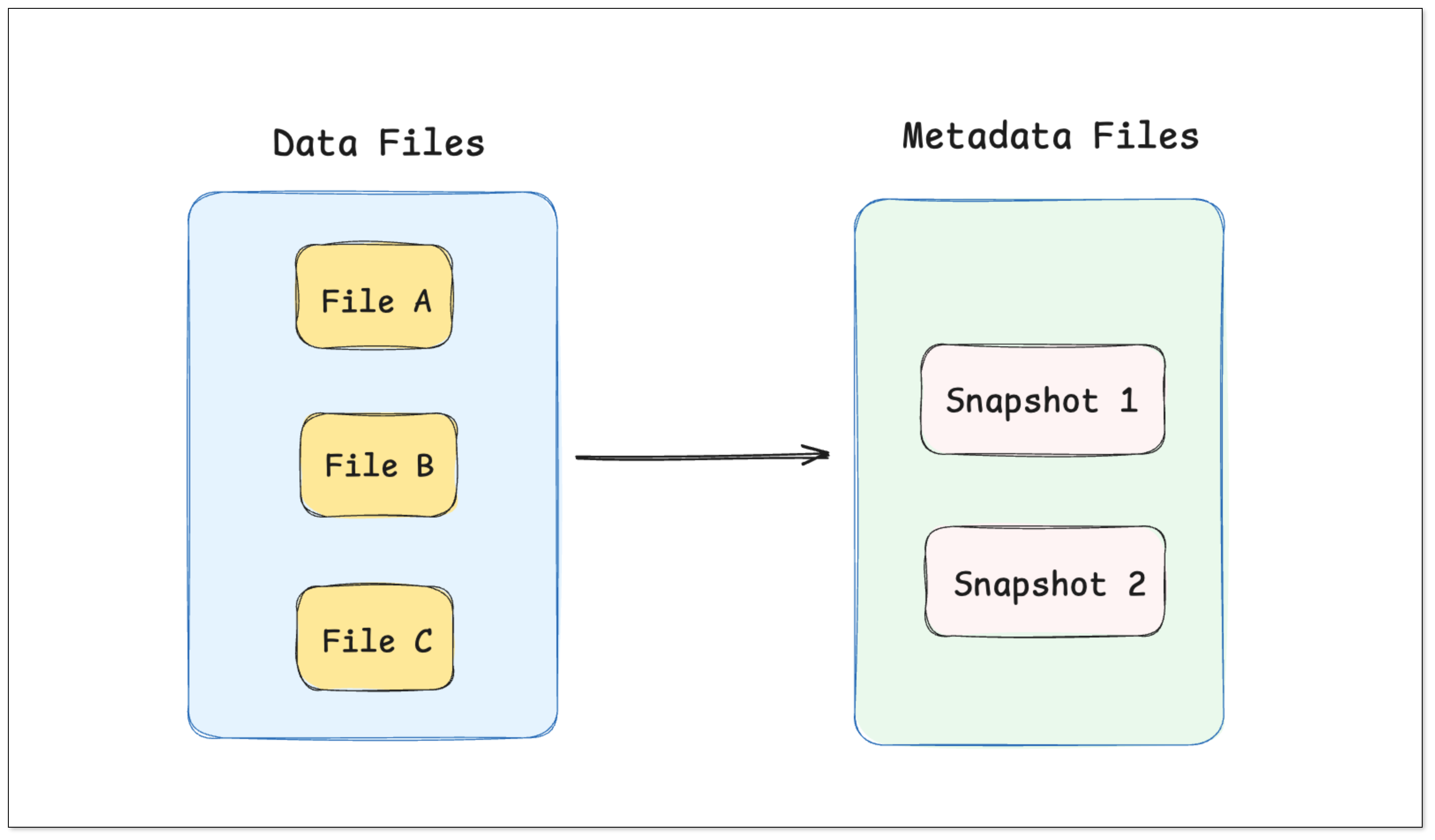 - 数据文件(Data Files) :真正存储用户数据的 物理文件,通常是 Parquet、ORC 等列式格式,写入后不可变。