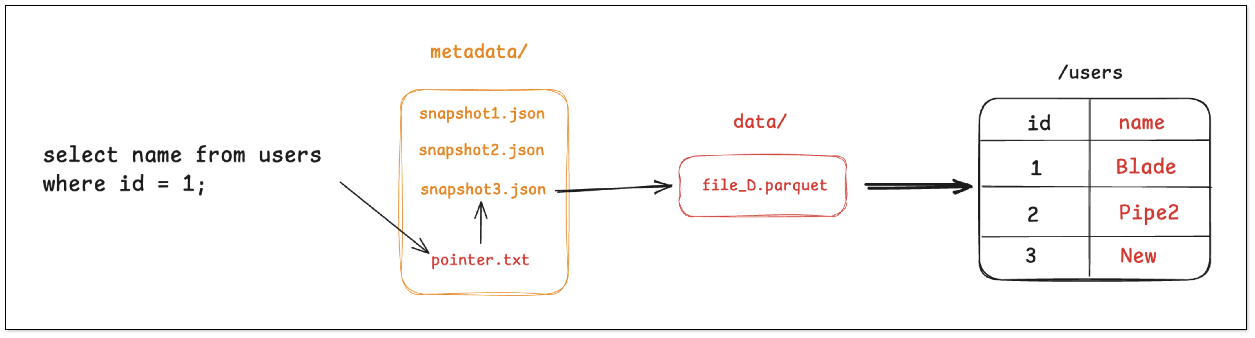 任何查询 users 表的查询请求,都会先找到 pointer.txt ,读取 **snapshot_1,** 然后直接去访问 file_A。