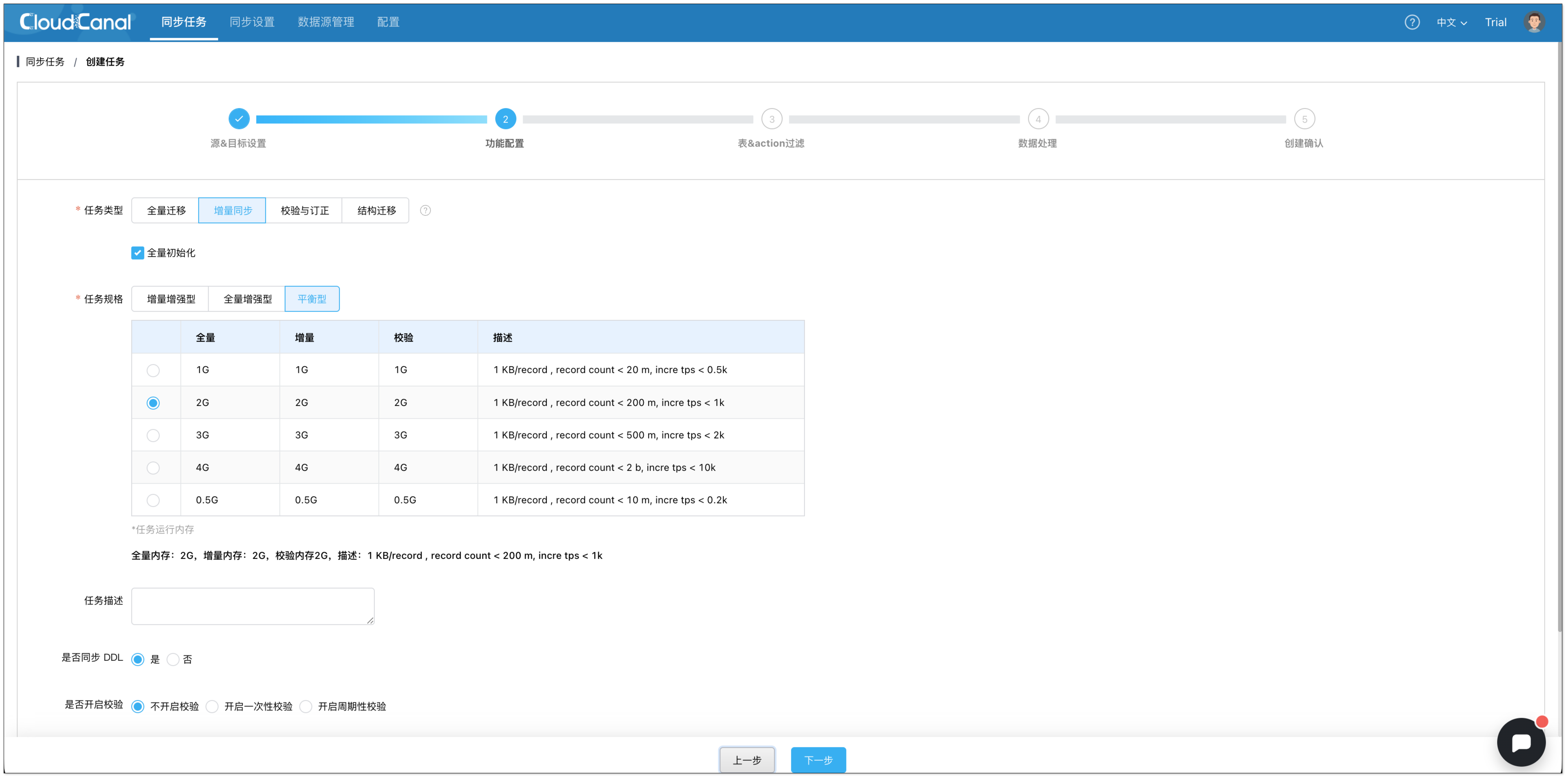 - 在 功能配置 页面,选择 增量同步 ,并勾选 全量初始化。