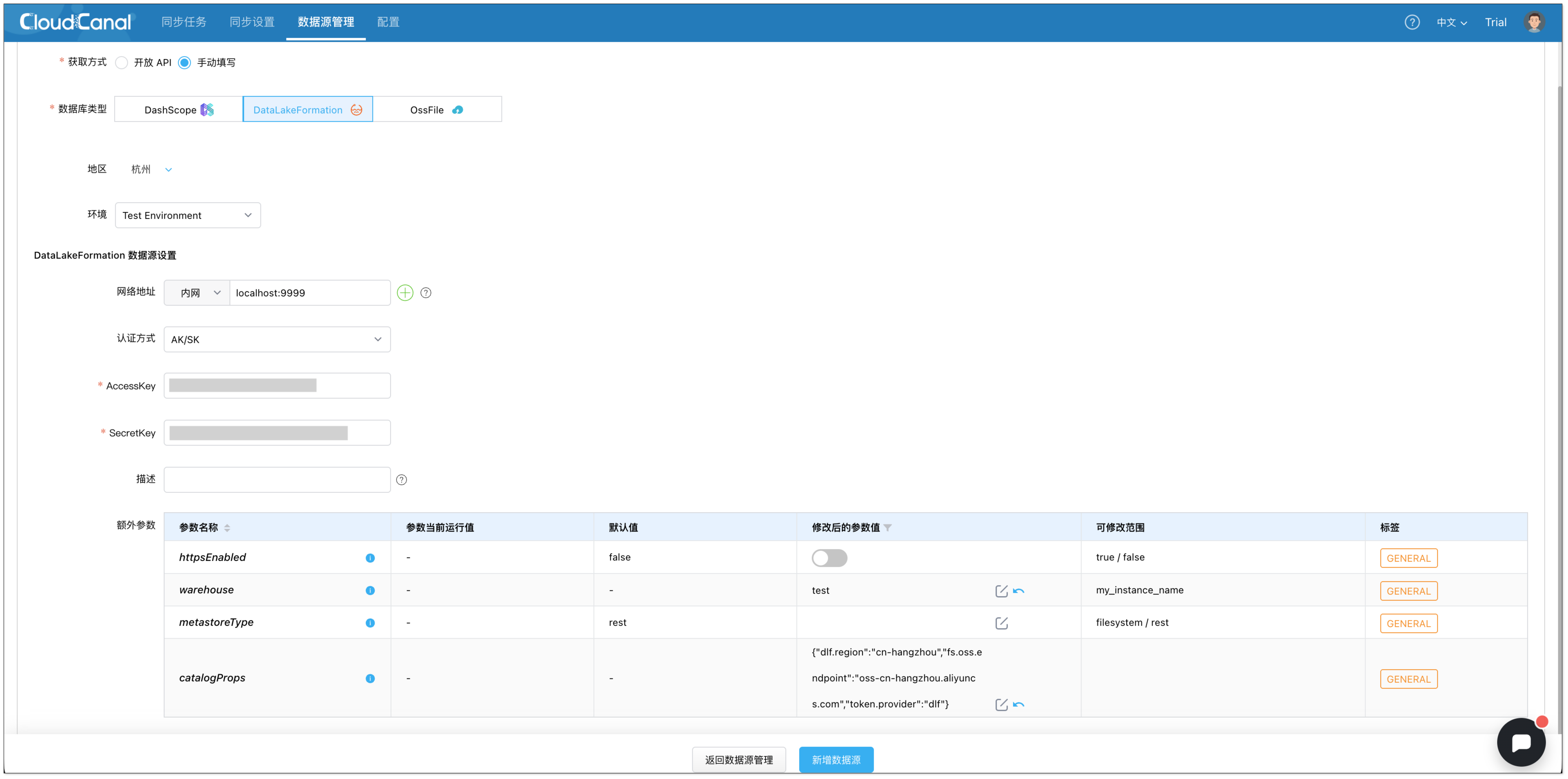 - 登录 CloudCanal 平台 ,点击 数据源管理 > 添加数据源 ,分别添加 MySQL 和 阿里云 DLF 数据源。