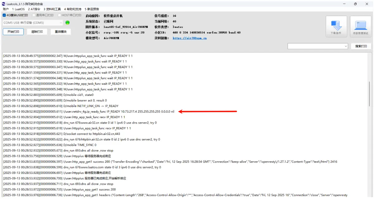 如下图所示,如出现类似 I/user.netdrv_4g.ip_ready_func IP_READY 10.73.217.4 255.255.255.255 0.0.0.0 nil 的日志,则表示 4g 网卡连接成功。