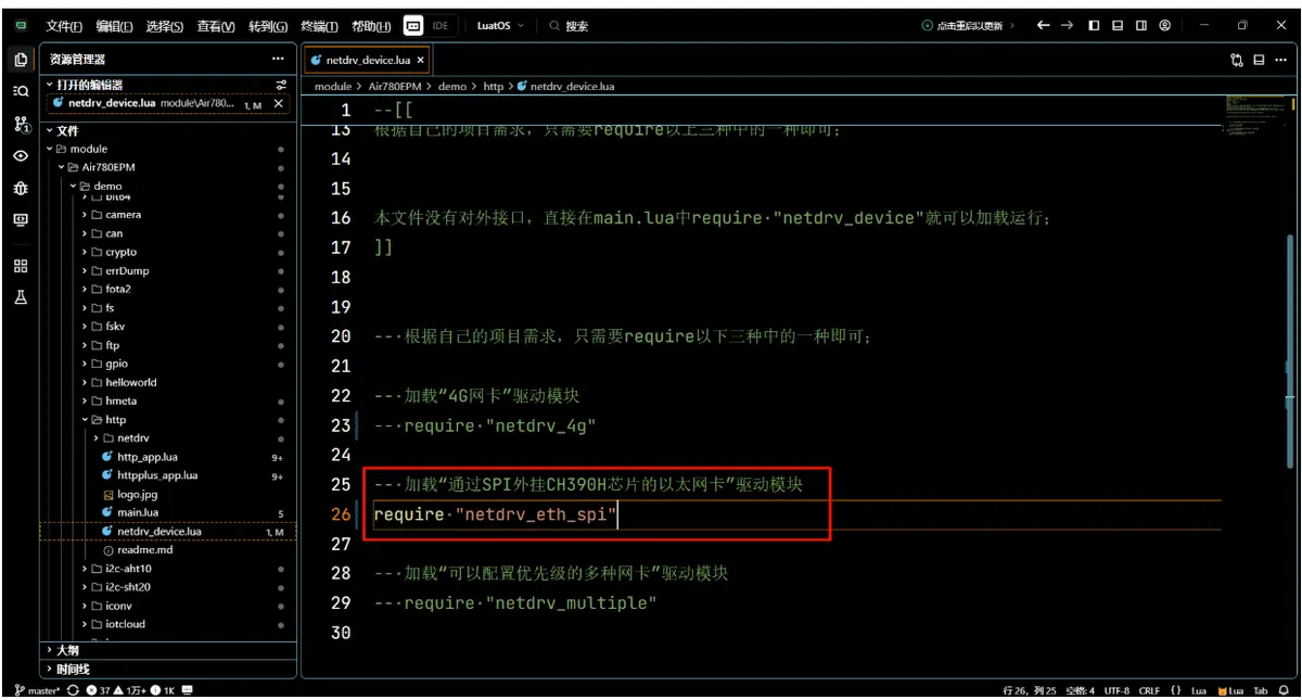 在 netdrv_device.lua 模块里只打开 netdrv_eth_spi 模块。如果是使用开发板,netdrv_eth_spi 模块中的代码不需要修改。