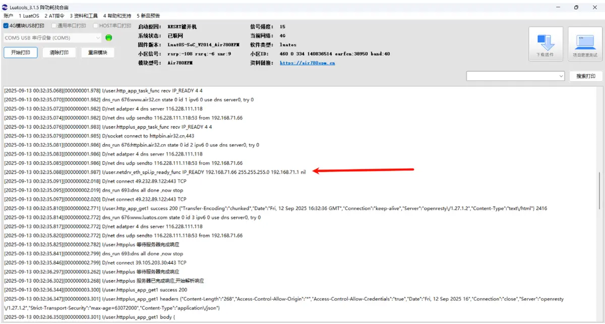 如出现类似 I/user.netdrv_eth_spi.ip_ready_func IP_READY 192.168.71.66 255.255.255.0 192.168.71.1 nil 的日志,则表示以太网卡联网成功。