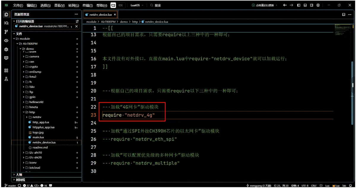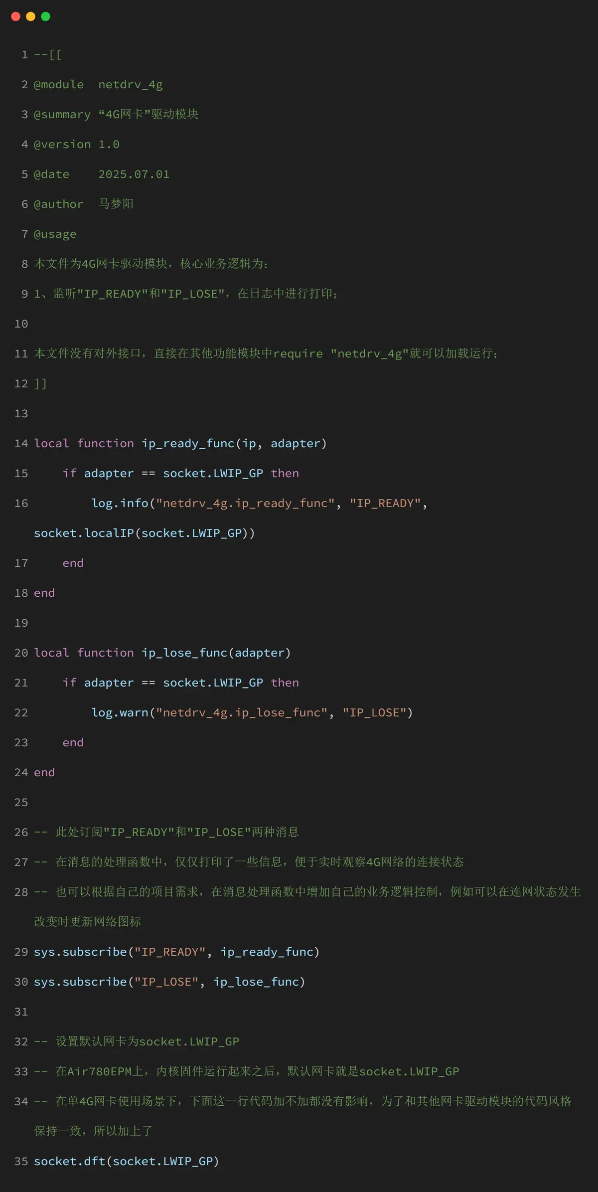 在 netdrv_device.lua 模块里只打开 netdrv_4g 模块。netdrv_4g.lua 模块中的代码不需要修改。