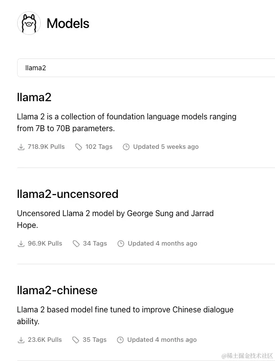 其中[model name]就是你想运行的本地大模型的名称,如果你不知道应该选择哪个模型,可以通过model library进行查看。这里我们选择llama2大模型。
