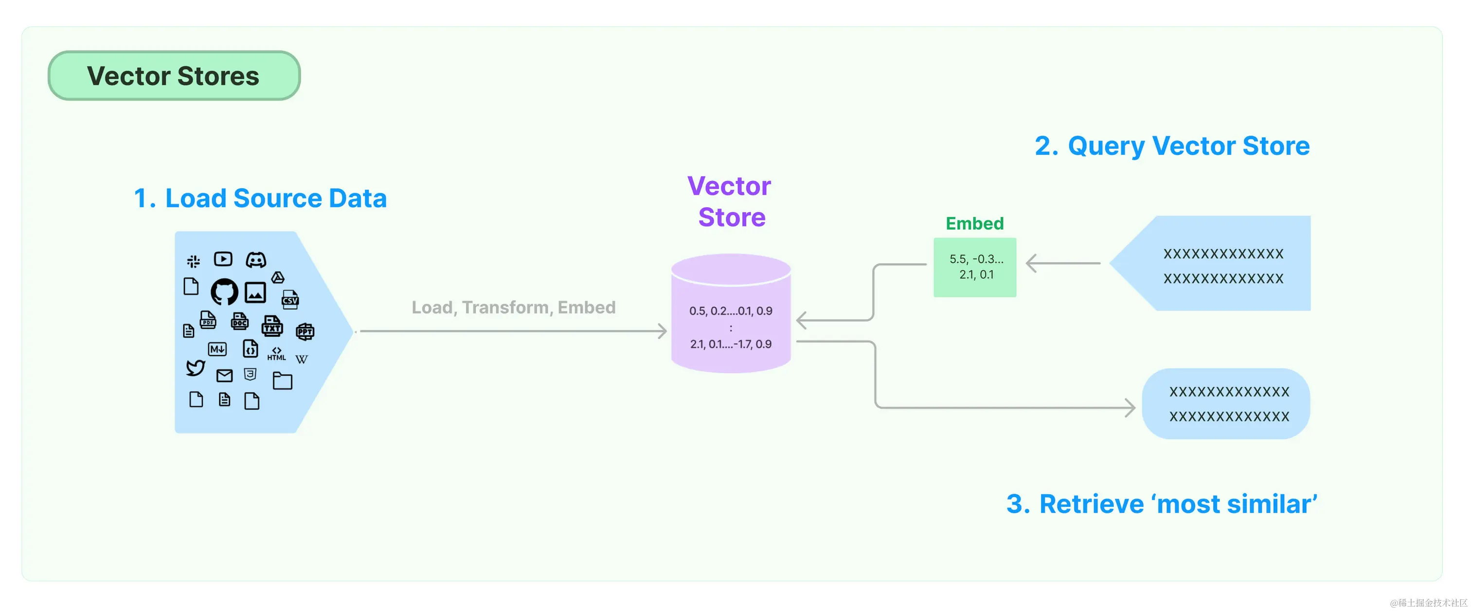 向量存储(Vector stores)是用于存储和检索文本嵌入向量的工具。这些向量是文本数据的数值表示,它们使得计算机能够理解和处理自然语言。向量存储对于支持复杂的搜索和检索任务至关重要,尤其是在处理大量文本数据时。