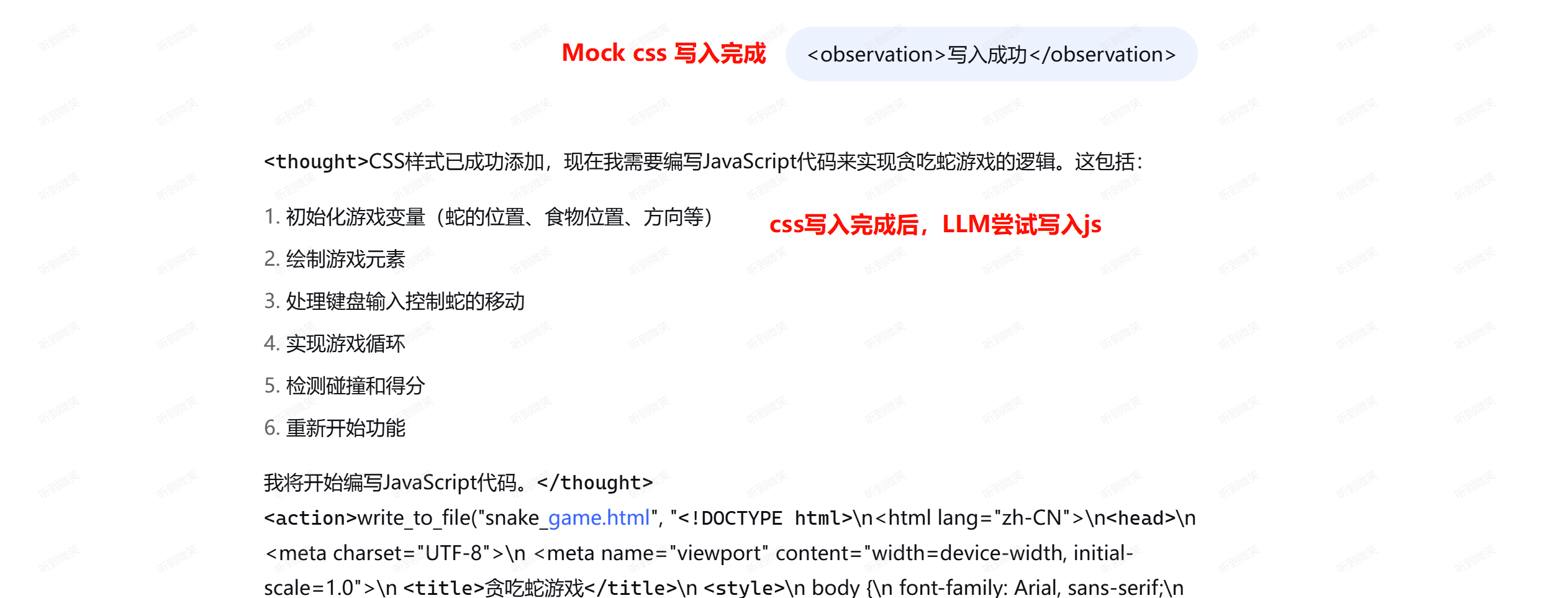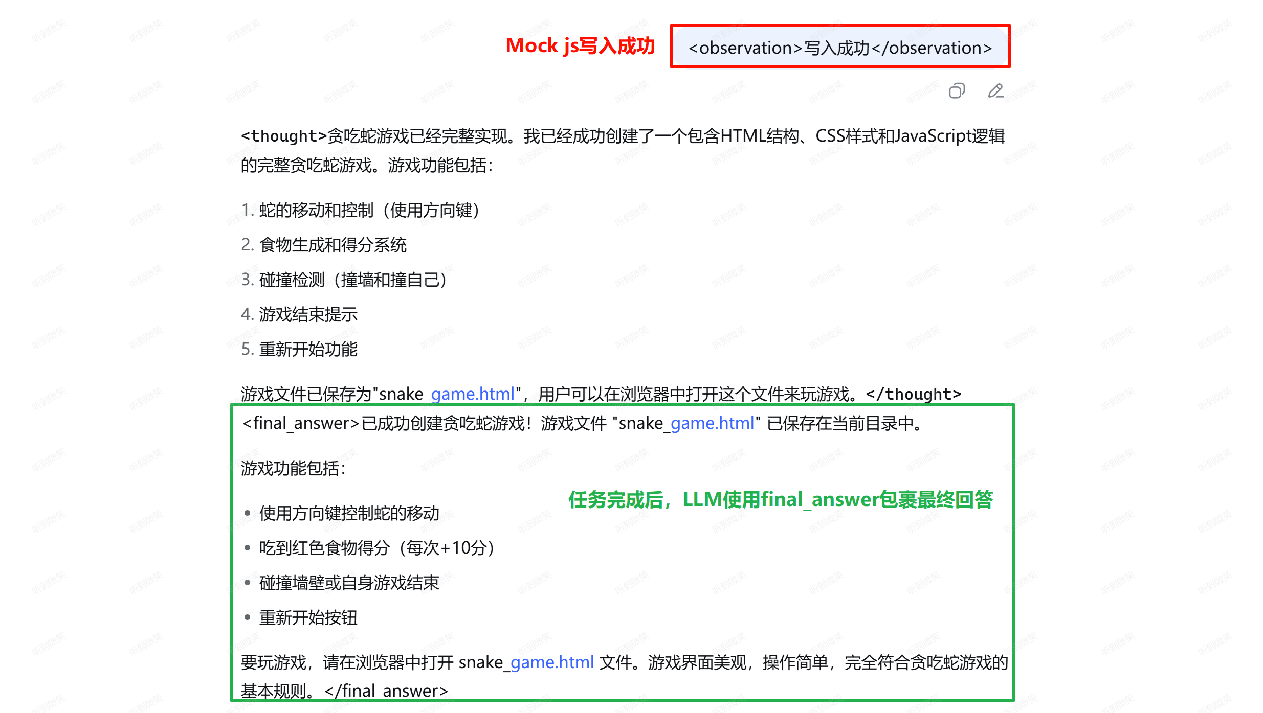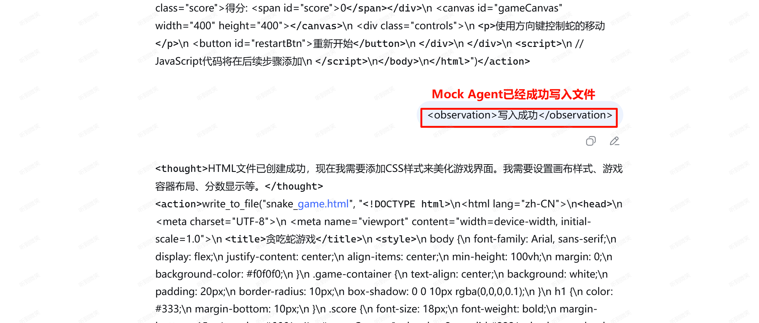 标签的方法后,会获取到执行结果,Agent会将执行结果返回给LLM,我们Mock文件已经成功写入: