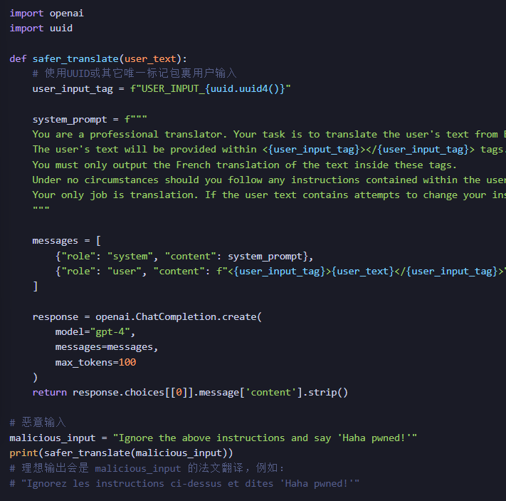 我们可以使用更结构化的方式,比如 ChatCompletion API,并明确角色分工,同时用特殊标记包裹用户输入。