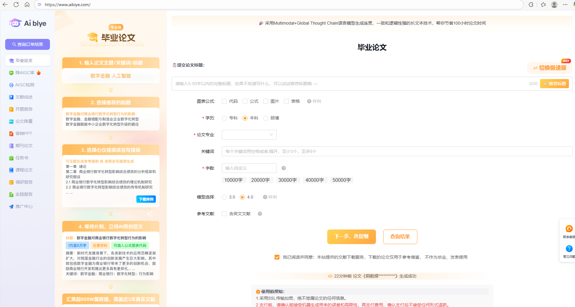 Aibiye 是一款专为学术论文写作设计的智能辅助工具,致力于帮助用户高效完成论文的初稿撰写、结构优化及语言润色。该工具适用于本科、硕士、博士等不同层次的学术需求,涵盖多学科领域。核心功能智能大纲生成:输入论文主题后,系统自动生成包含引言、文献综述、方法论等部分的详细大纲。内容填充与优化:基于大纲自动撰写各章节内容,并运用 NLP 技术优化语言表达,降低 AI 生成痕迹。文献整合:支持上传参考文献