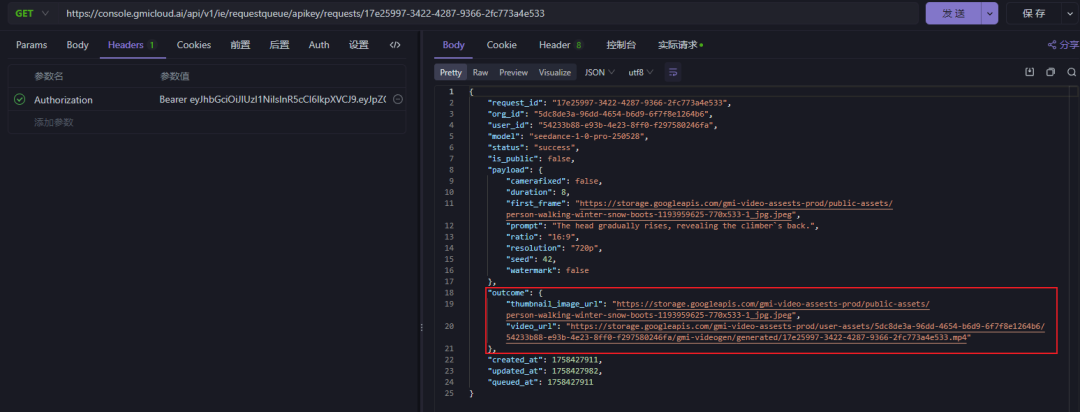 以下请求中的红框部分就是我们生成的视频了,包括封面和视频链接,我们打开查看一下