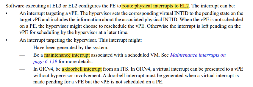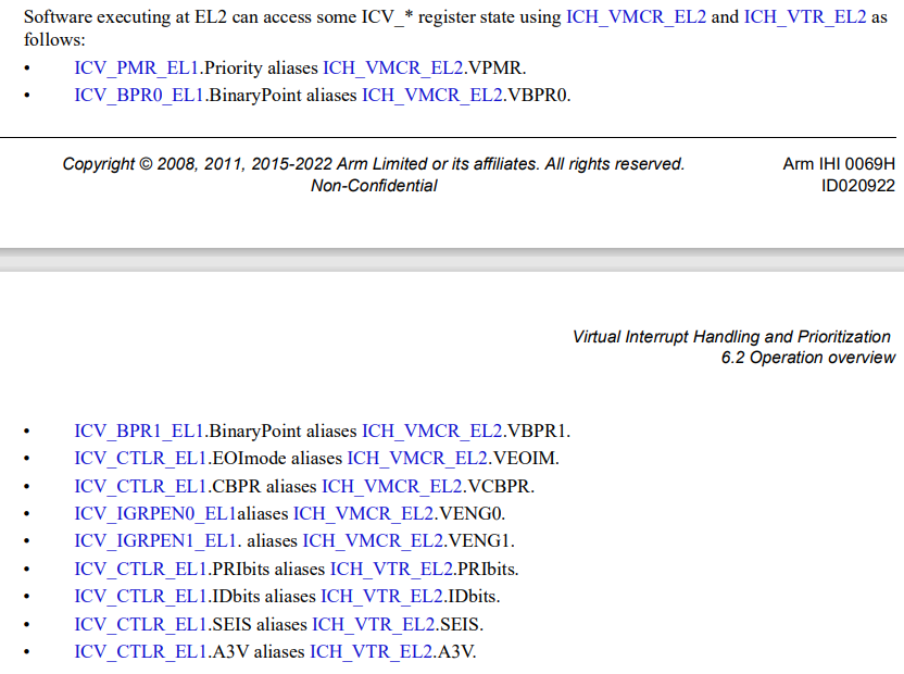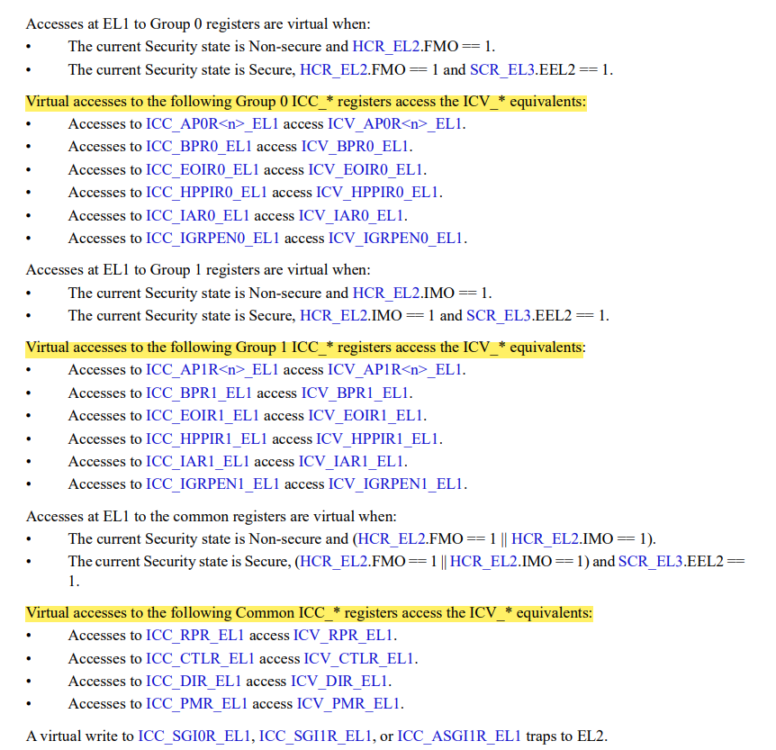 虚拟机里vcpu都是通过ICC_*来访问gicc,但具体访问的是虚拟的(ICV_*),还是物理的(ICC_*)是通过HCR_EL2.{IMO, FMO}来判断的,如果其设置为1,表示虚拟化中断路由开启,访问的是ICV,否则访问的是ICC。
