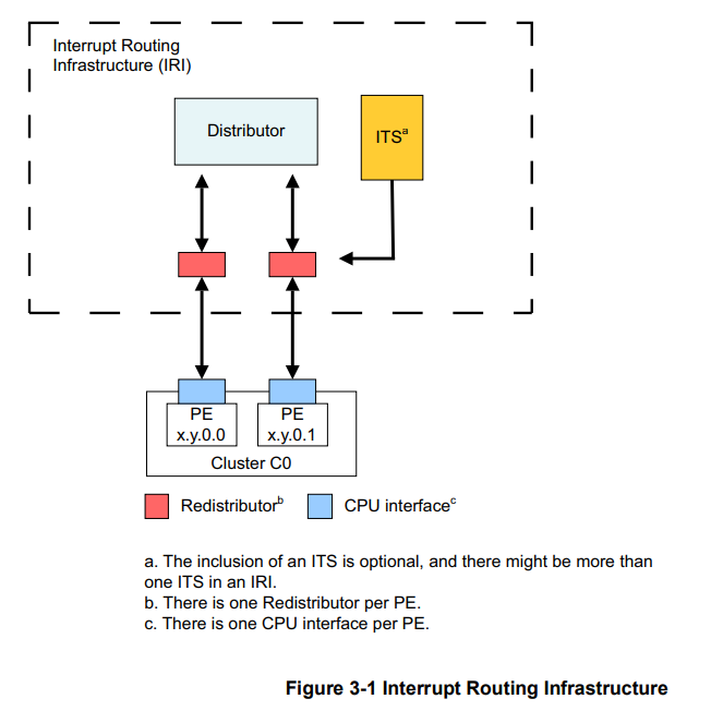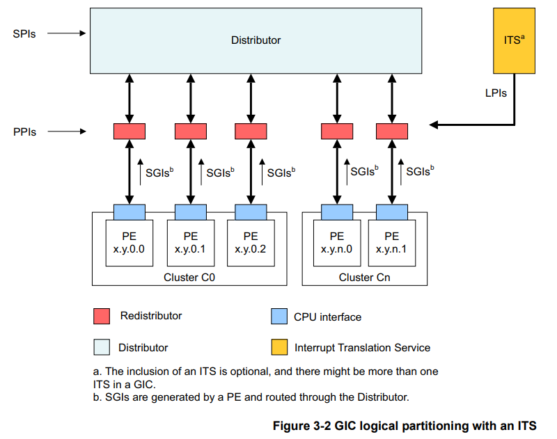 在gicv3中ITS是可选组件;gicv4中ITS是必须包含的一个组件,以支持虚拟LPI的注入,如下图: