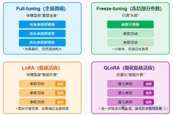 这四种方法分别是:Full-tuning(全量微调)、Freeze-tuning(冻结部分参数微调)、LoRA(低秩适应)和QLoRA(量化低秩适应)。它们各有绝活,能在不同情况下帮你省时省力又保证效果。接下来,我们就用大白话把它们讲明白。