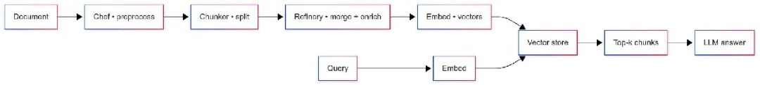 名字听起来好玩,但工作很标准。Document是你源文本。Chef是预处理,修空格、坏OCR或怪Unicode。Chunker是你选的分割器。Refinery是后处理,合并零散片段、标记元数据、附加嵌入。Friends是分块的去处,要么是向量存储,要么是文件导出。如果你喜欢中性标签,换成预处理、分割、精炼、输出,一一对应。