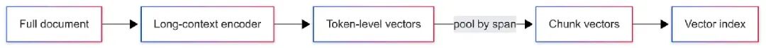 有时候你希望每个分块向量记住文档的其余部分。Late chunking反转顺序。你先用长上下文编码器跑一遍全文,拿到token级向量,再聚合成分块向量。每个分块向量都带有全局线索,避免单独嵌入切片时丢失信息。